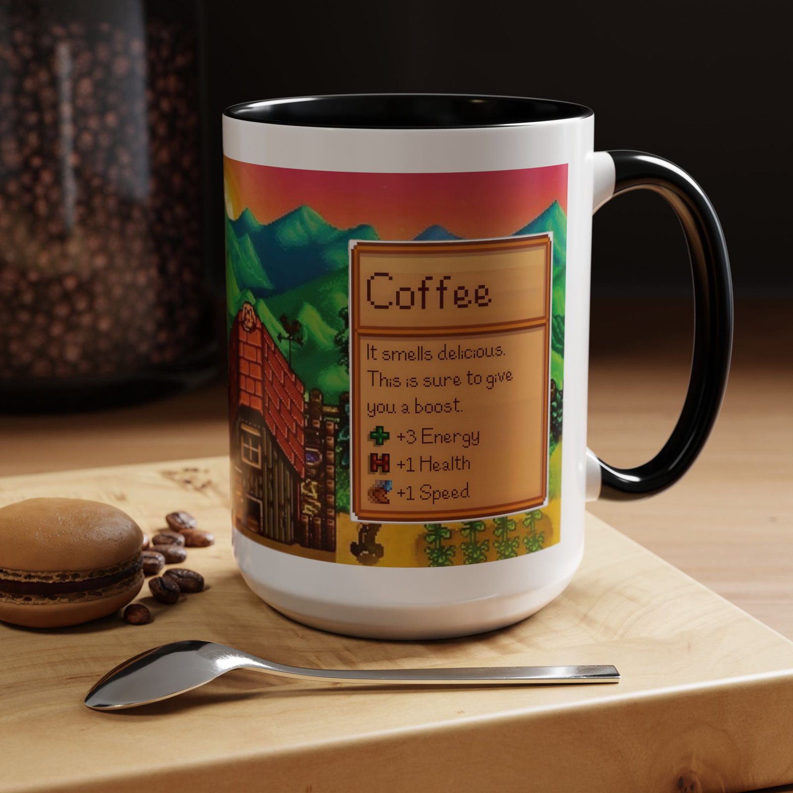 This 15oz white ceramic mug features a pixel-art farm scene and a Stardew Valley-inspired item description box highlighting coffee’s in-game stats like +3 Energy and +1 Speed.