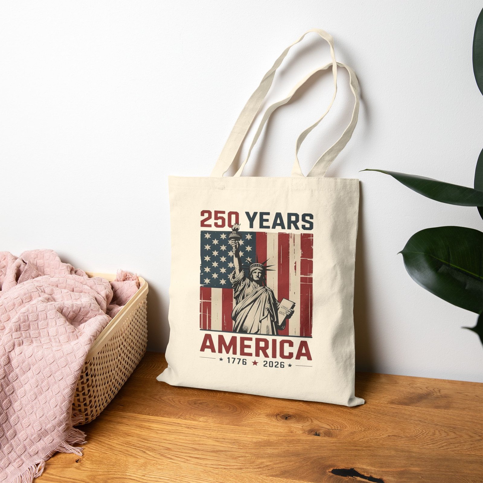 Celebrate the United States Semiquincentennial with this “250 Years America” tote, featuring the historic 1776–2026 milestone dates. Showcases a high-detail Statue of Liberty illustration set against a vintage-style distressed American flag for a timeless heritage aesthetic. A perfect functional memento for history enthusiasts, teachers, and proud citizens celebrating 250 years of American independence.