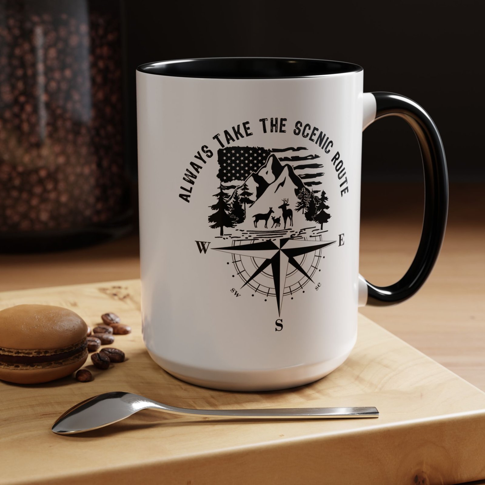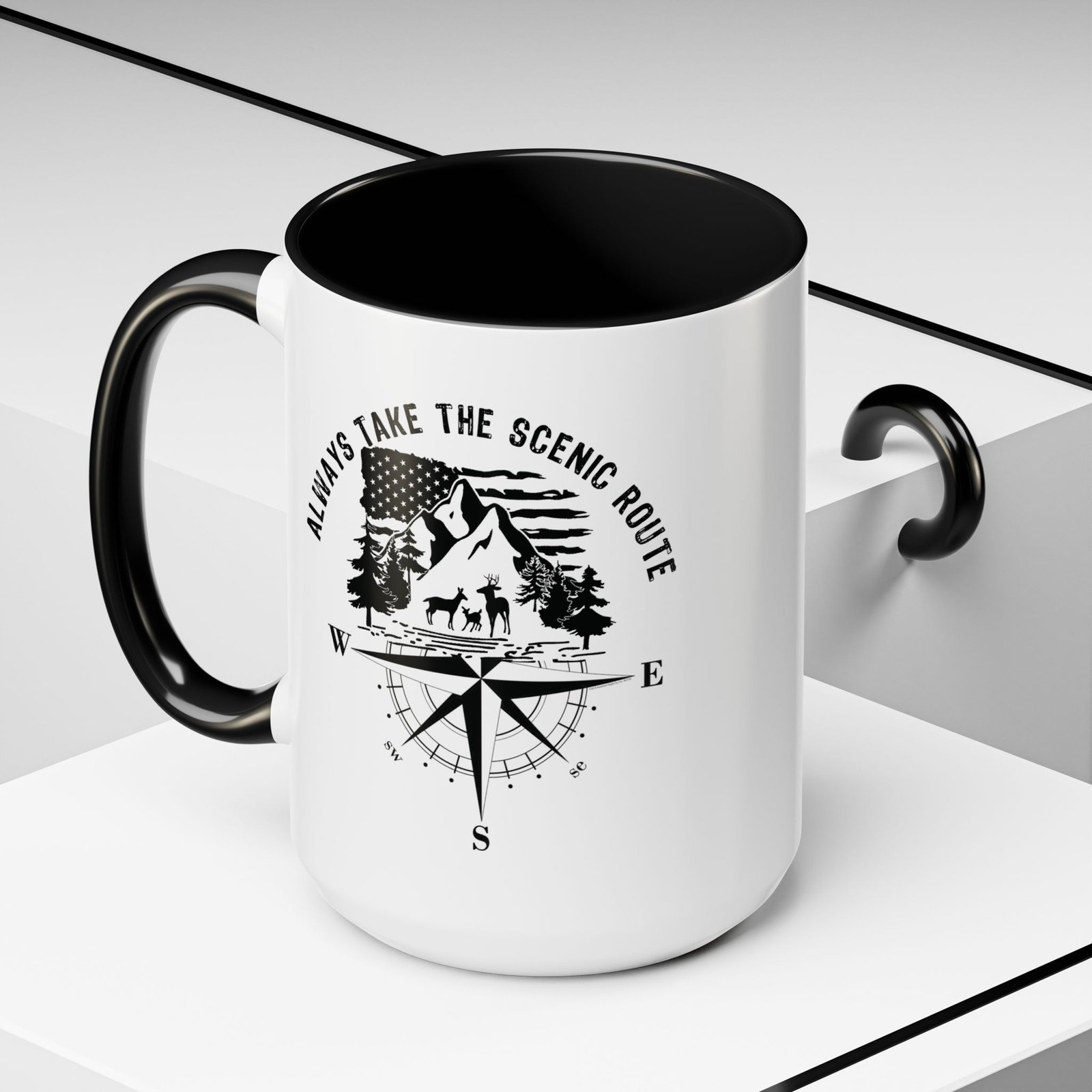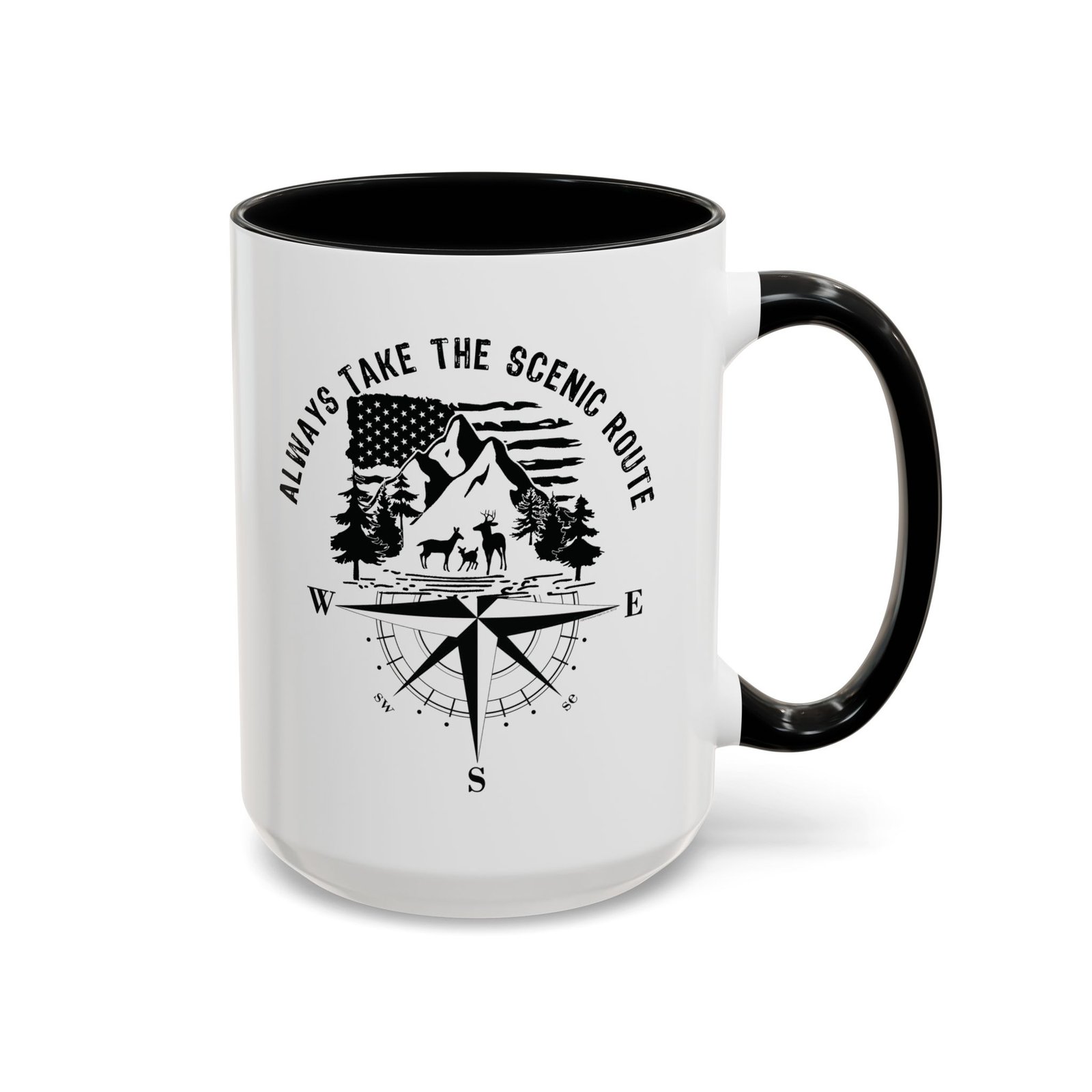 Embrace the call of the wild with this premium 15oz white ceramic mug. The design features a detailed mountain and forest wilderness scene with a deer family, set against a waving American flag and a classic compass rose. Topped with the inspiring “ALWAYS TAKE THE SCENIC ROUTE” slogan and finished with a vibrant red handle and interior, it is the ultimate companion for those who love to explore the great American outdoors.