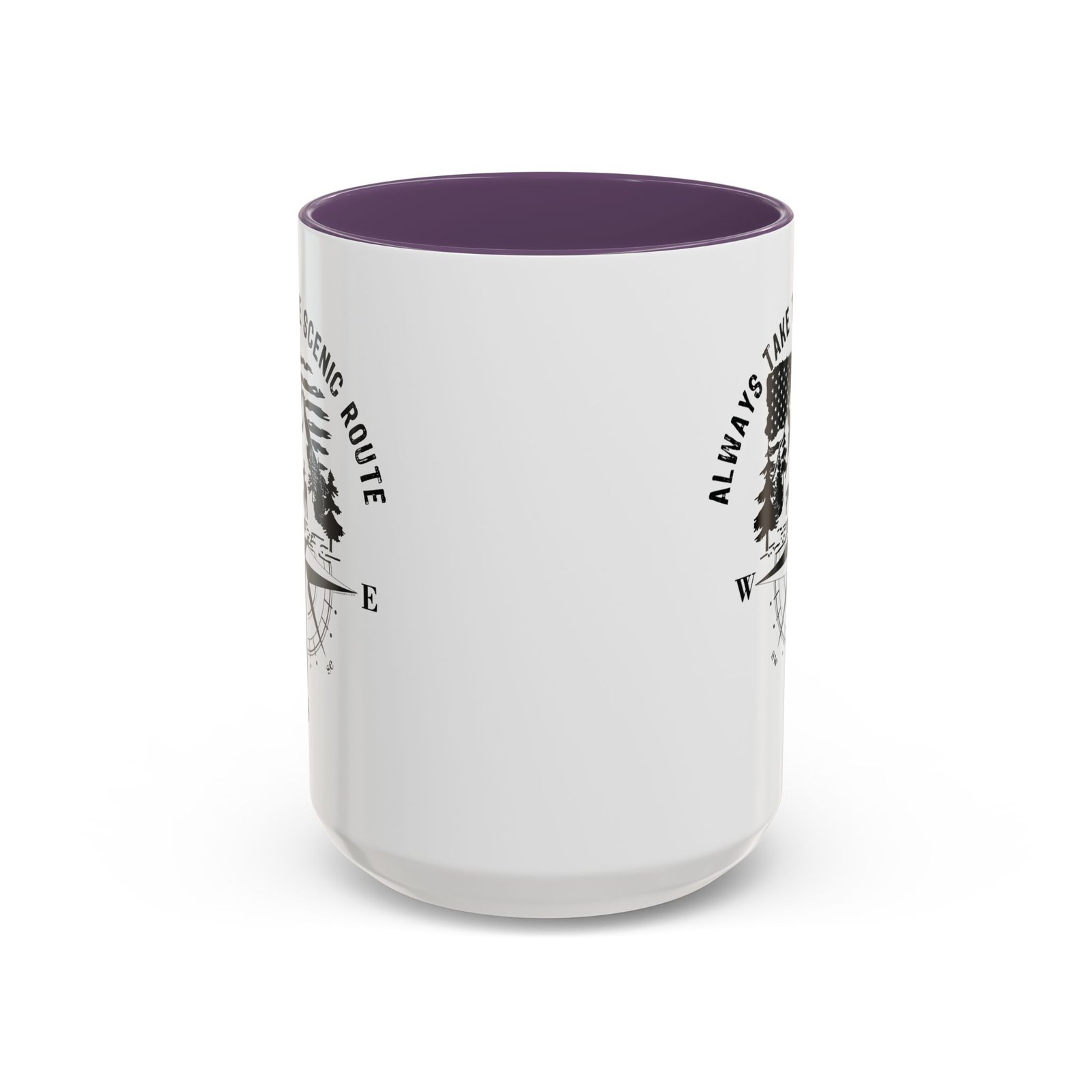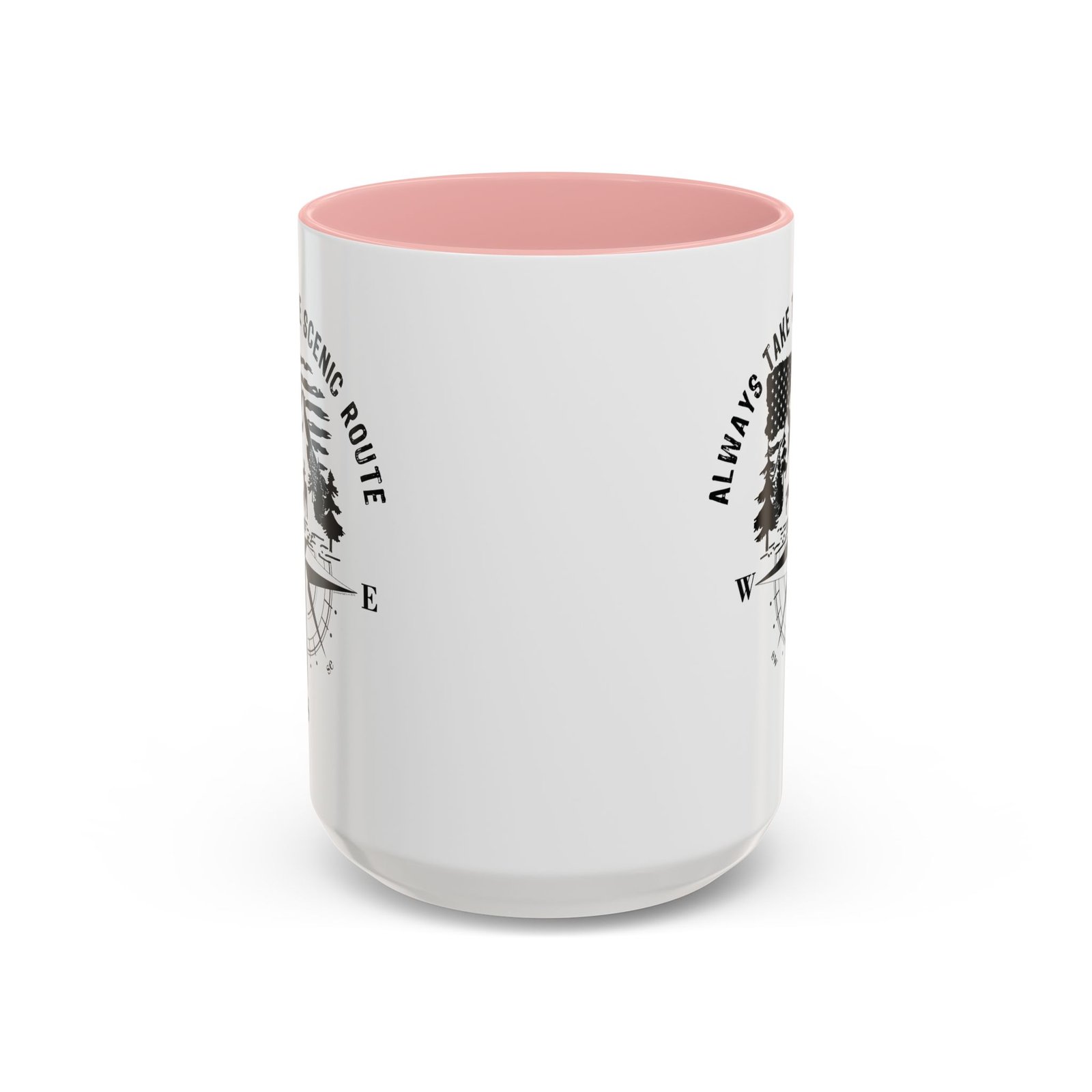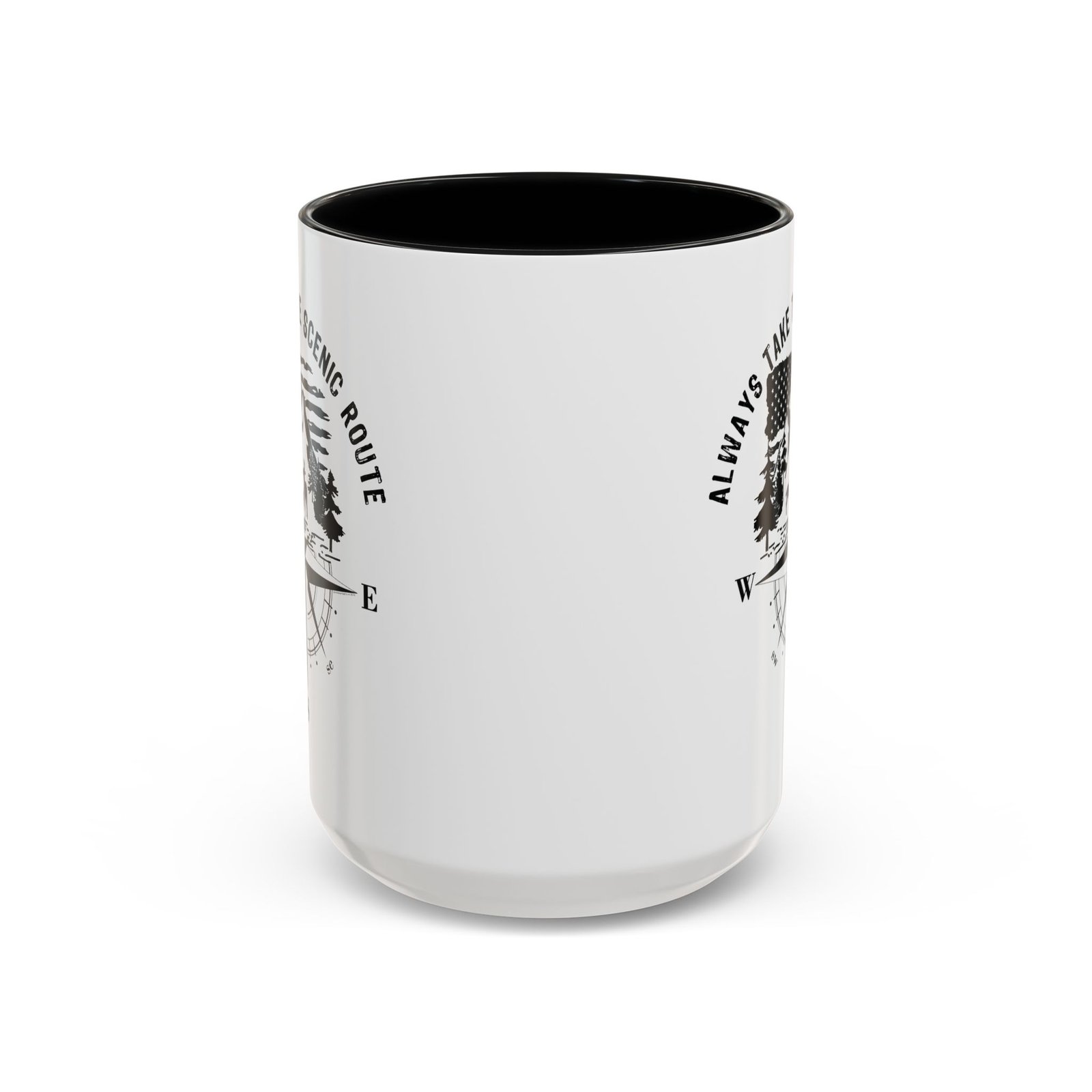 Embrace the call of the wild with this premium 15oz white ceramic mug. The design features a detailed mountain and forest wilderness scene with a deer family, set against a waving American flag and a classic compass rose. Topped with the inspiring “ALWAYS TAKE THE SCENIC ROUTE” slogan and finished with a vibrant red handle and interior, it is the ultimate companion for those who love to explore the great American outdoors.