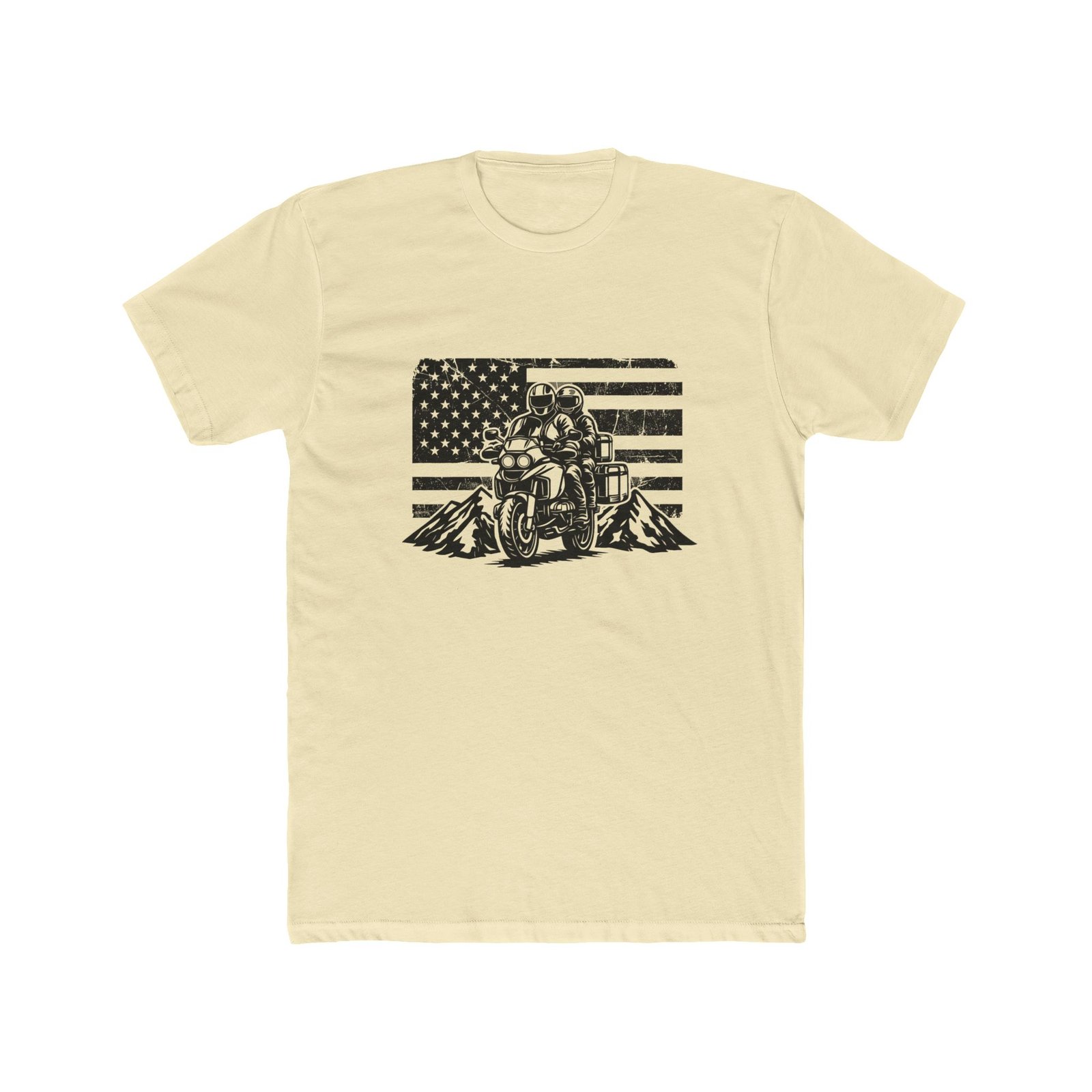 Fuel your wanderlust with our American Adventure Touring T-Shirt. This design captures the spirit of the open road, featuring a detailed adventure motorcycle carrying two riders against a rugged mountain backdrop and a distressed American flag.