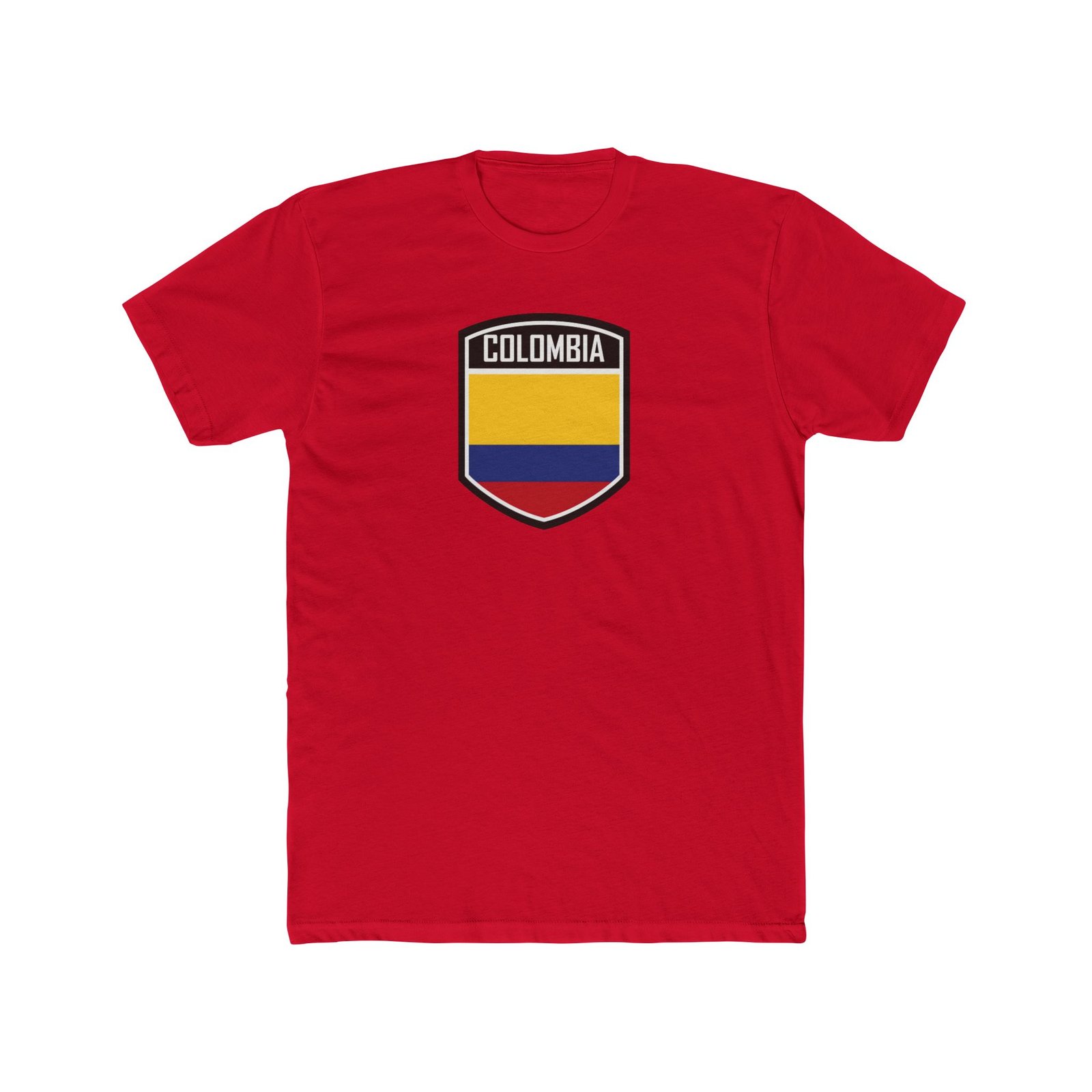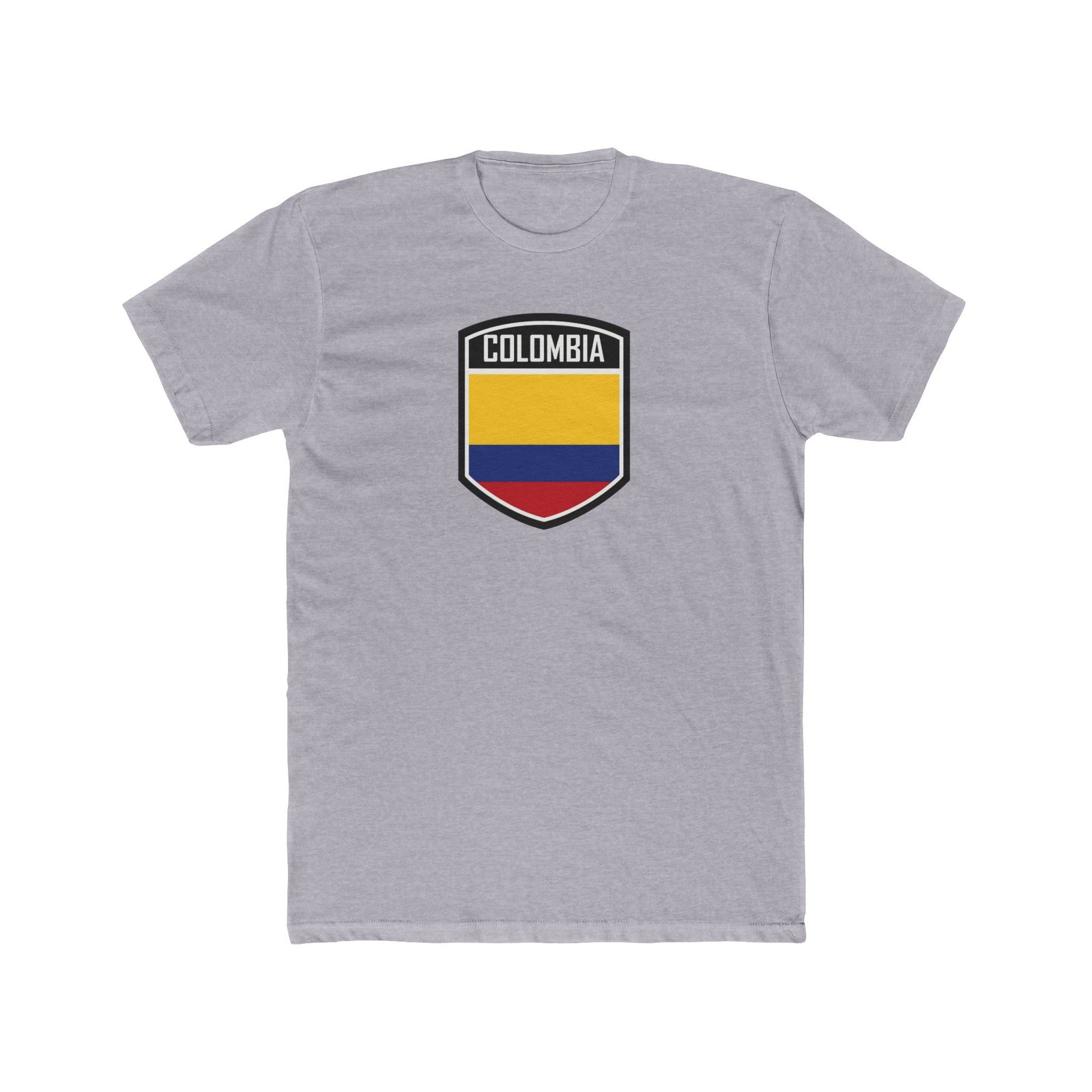 Colombia crest t-shirt, Colombian flag shield, Colombian heritage apparel, Colombia national pride shirt, unisex white graphic tee, South American pride clothing, Colombia shield graphic, premium cotton flag shirt, Colombia souvenir t-shirt, Colombian flag gift.