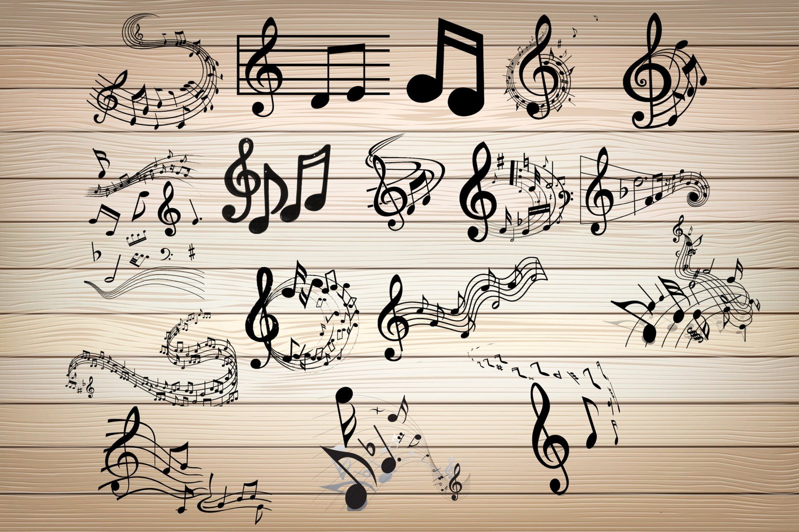 This set includes 12 distinct musical graphics featuring flowing staves, treble clefs, and various note types such as whole, half, and quarter notes. This digital asset collection features a diverse range of graphics, from vibrant musical elements to high-contrast silhouettes, ideal for apparel design, vinyl cutting, and professional branding.
