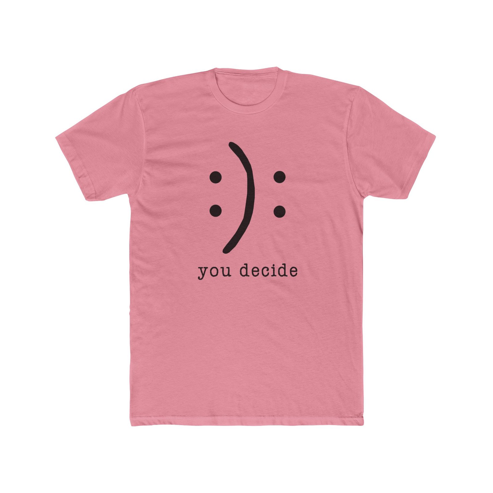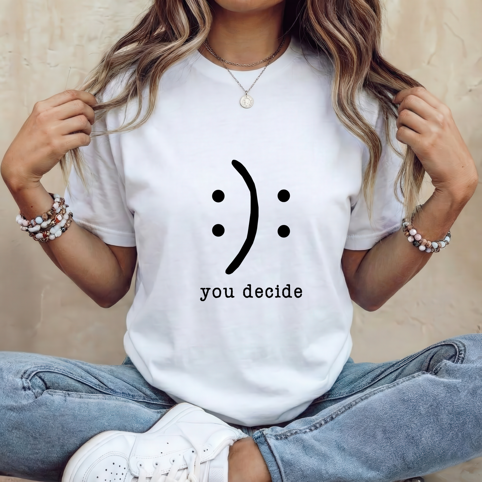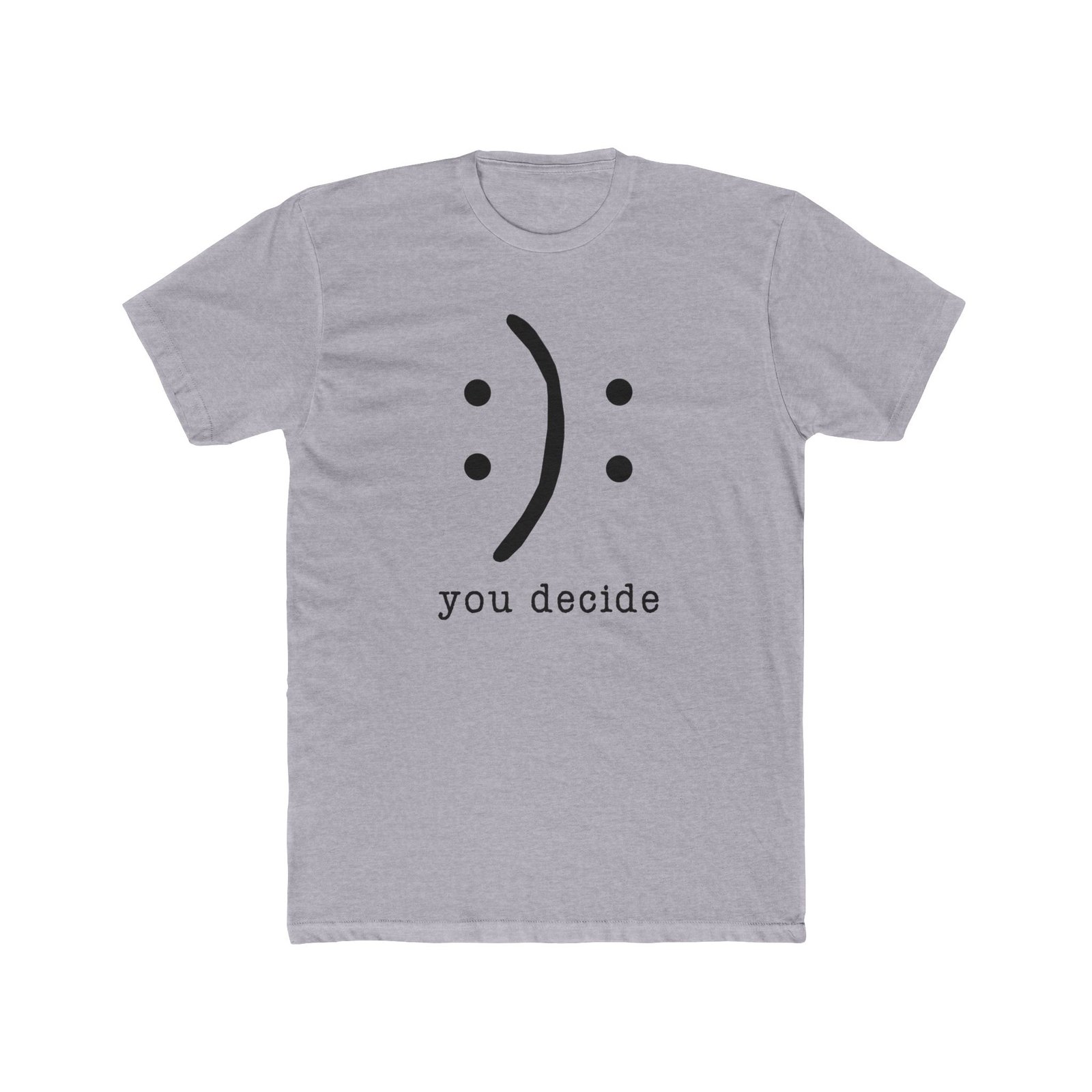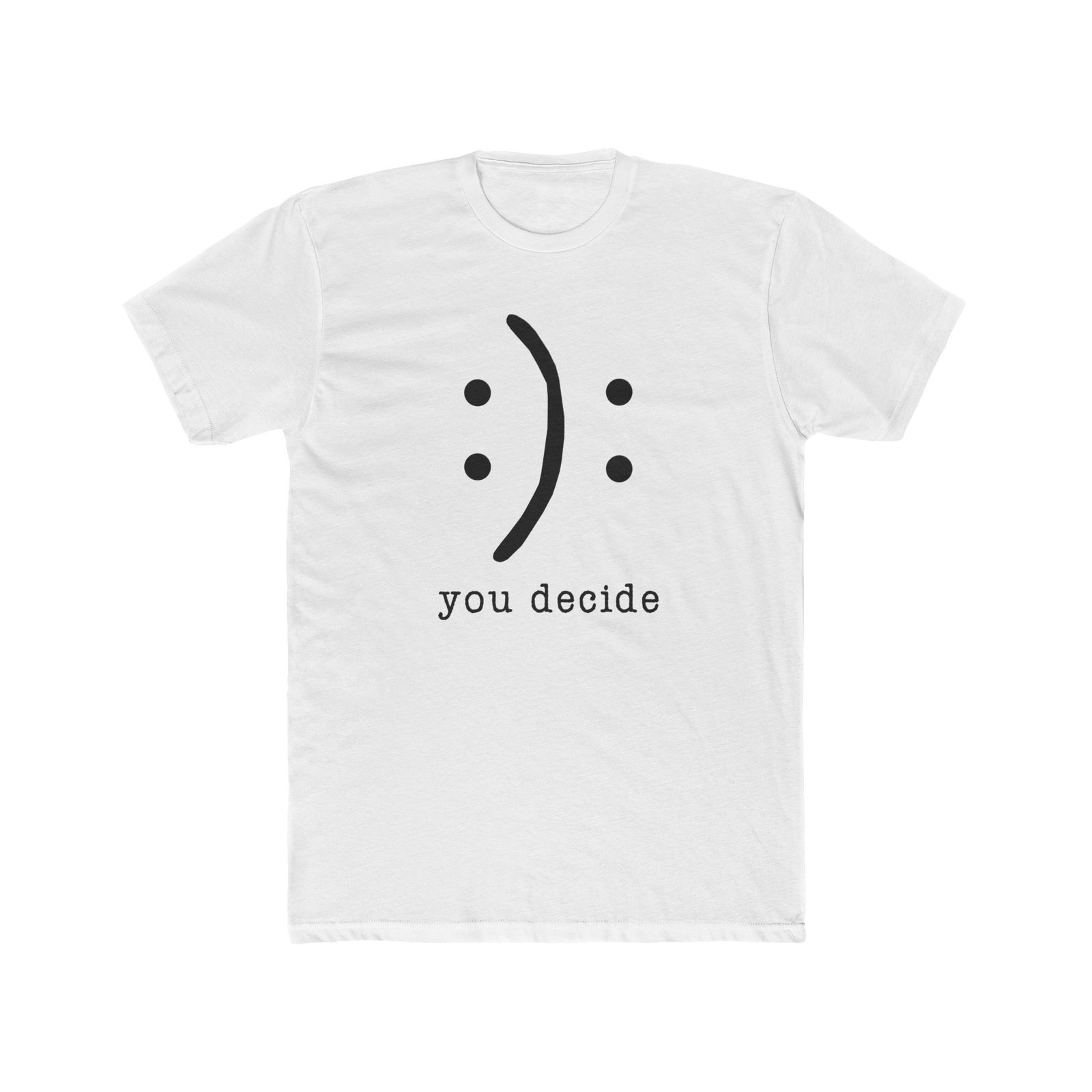 Master Your Mindset Embrace the power of perspective with our “You Decide” Graphic Tee. Featuring an ingenious minimalist design that depicts both a smile and a frown depending on how you look at it, this shirt is a wearable reminder that our reality is shaped by our outlook