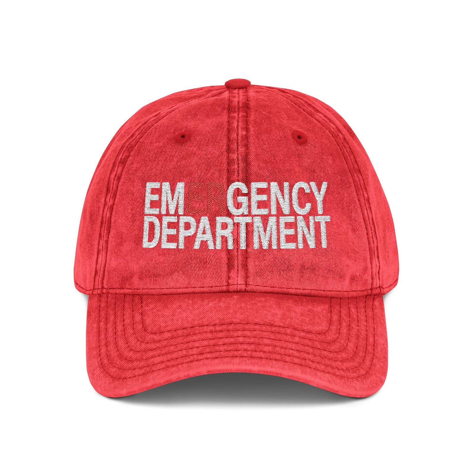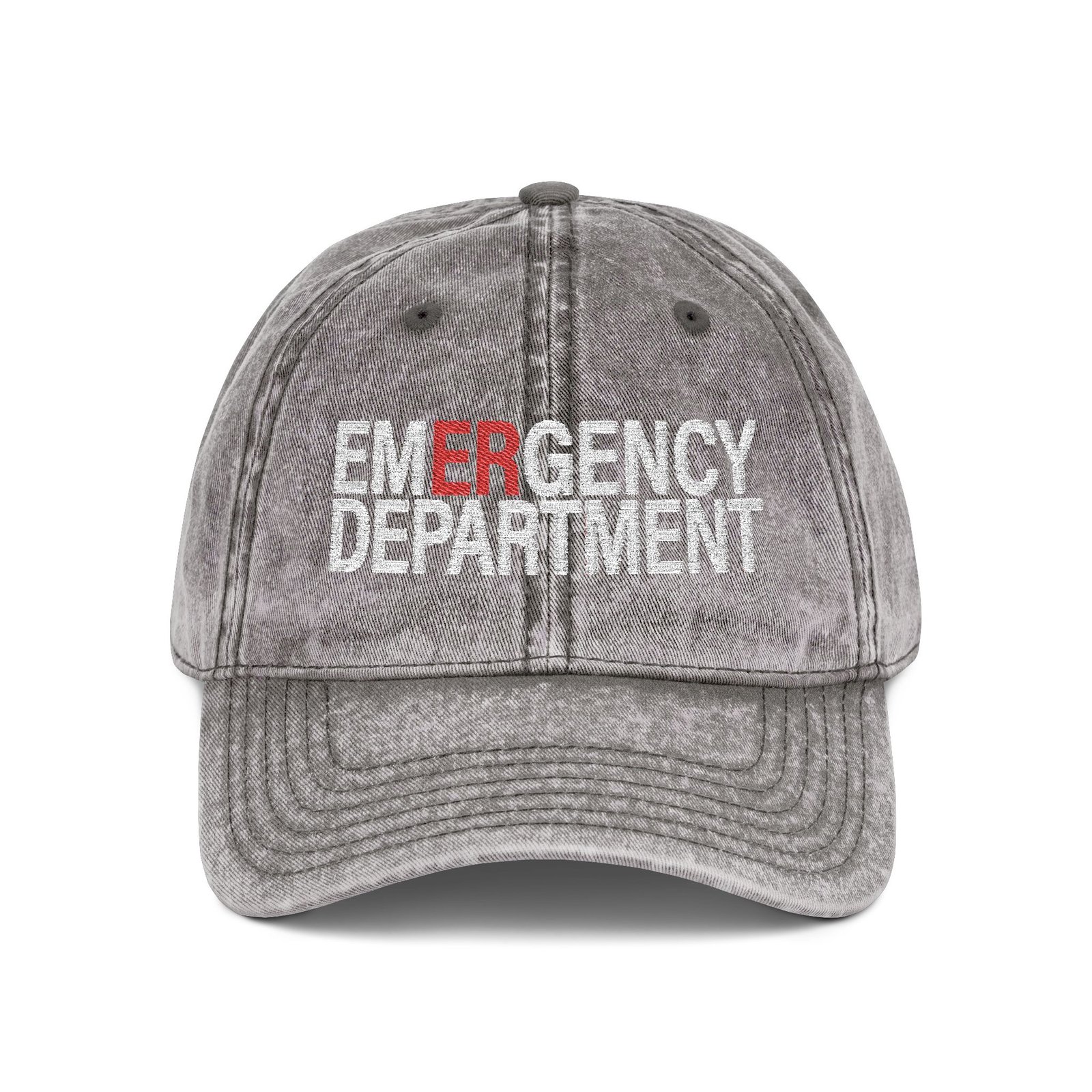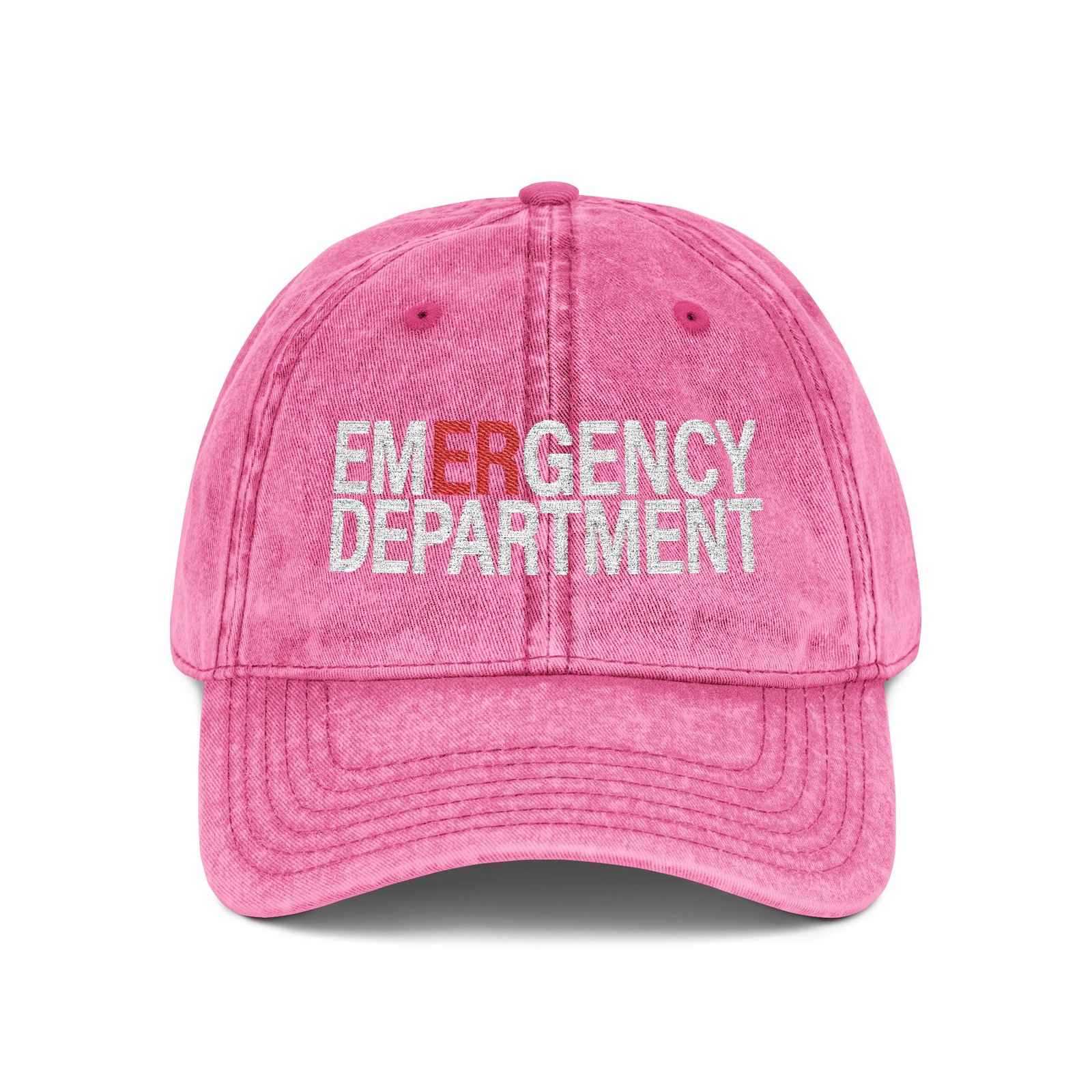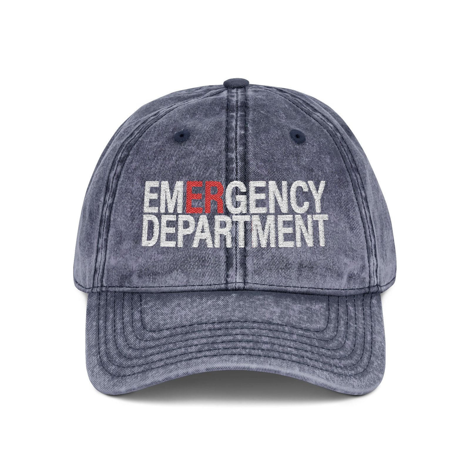 Emergency Department hat, ER nurse cap, medical professional headwear, embroidered doctor hat, vintage washed cotton cap, hospital staff apparel, ER doctor gift, trauma nurse hat, EMS baseball cap, medical student graduation gift, scrub life accessories, nursing student hat, healthcare worker gift, distressed medical cap.