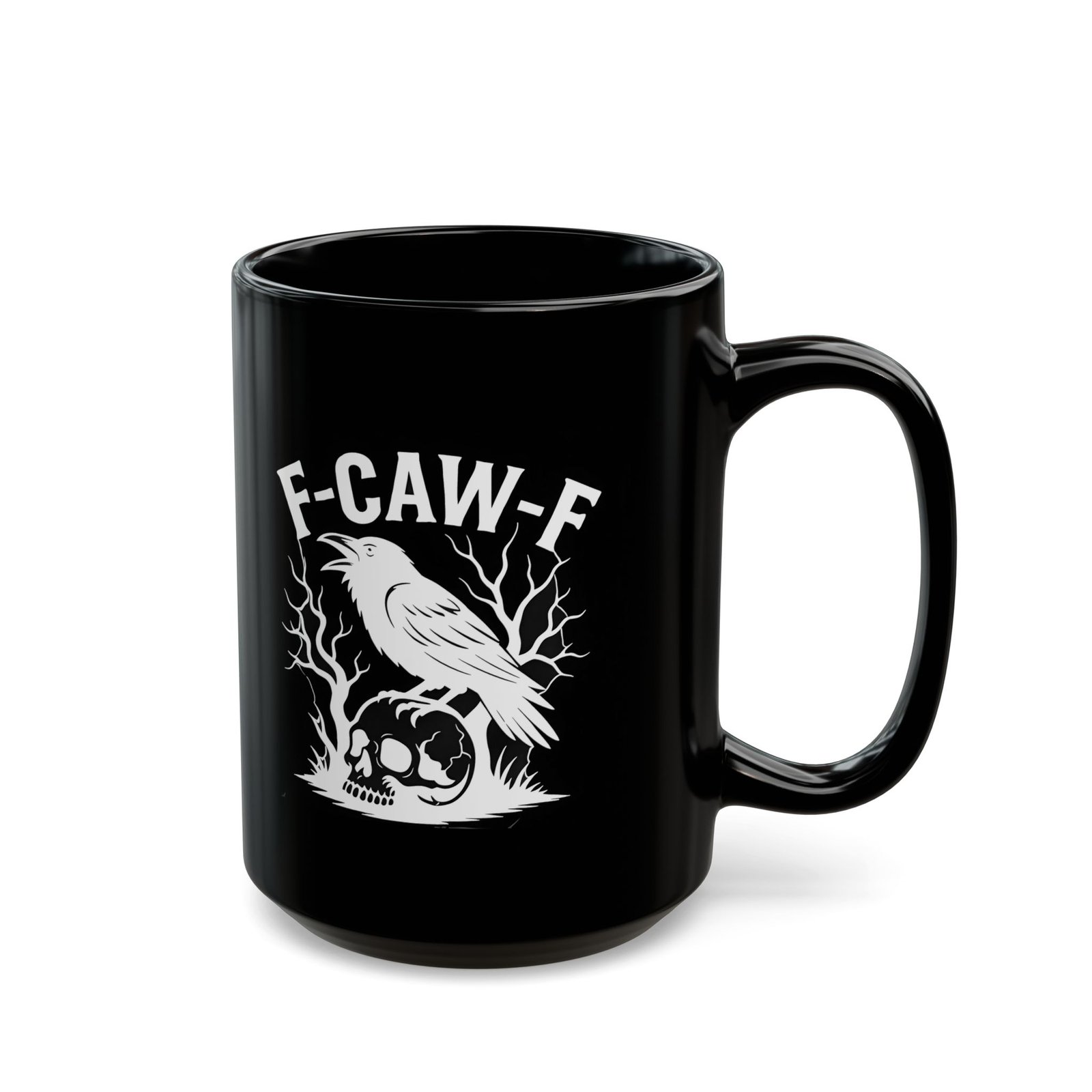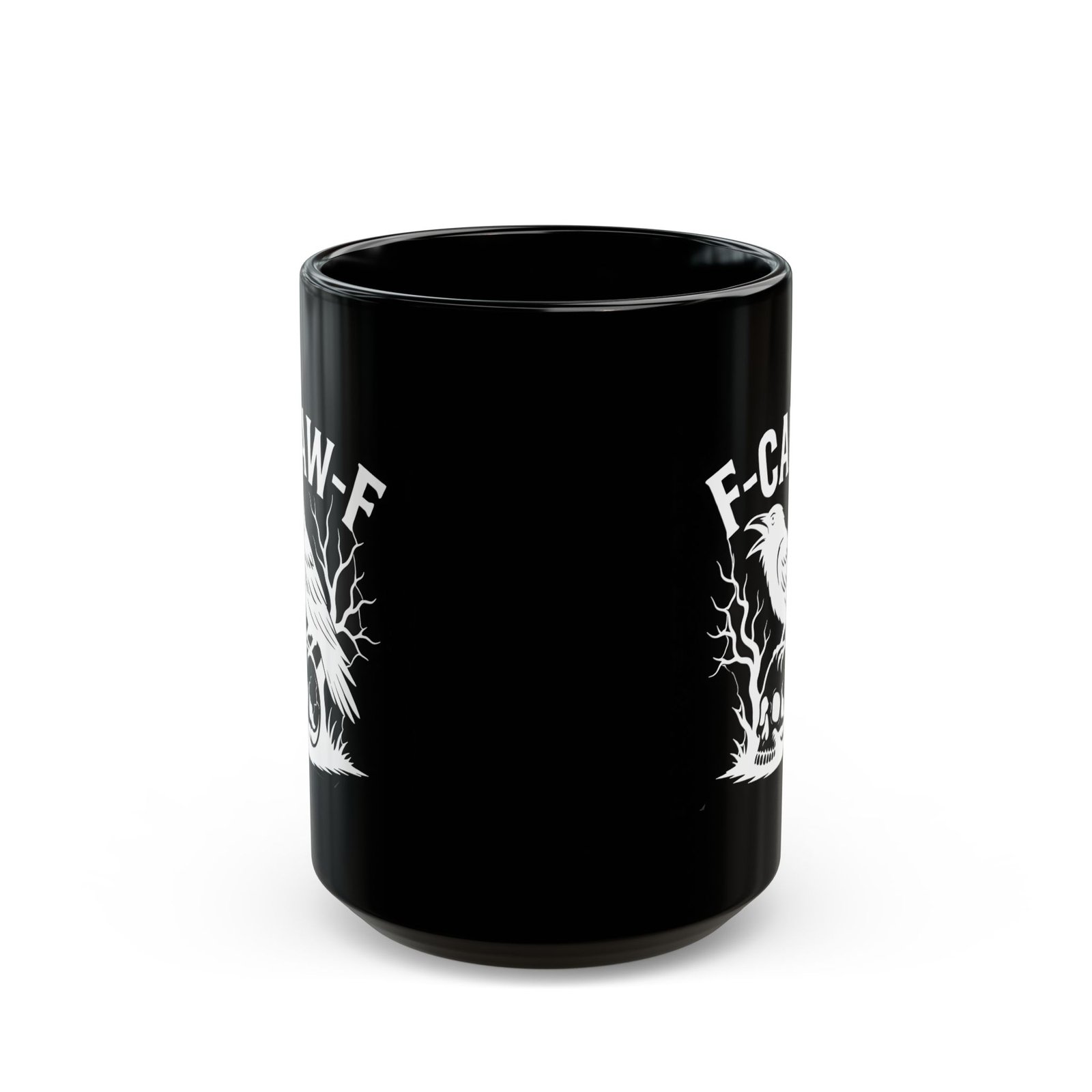 “F-CAW-F” Crow Sarcastic Coffee Mug – 15oz Black Ceramic Cup – Edgy Raven & Skull Graphic Gift