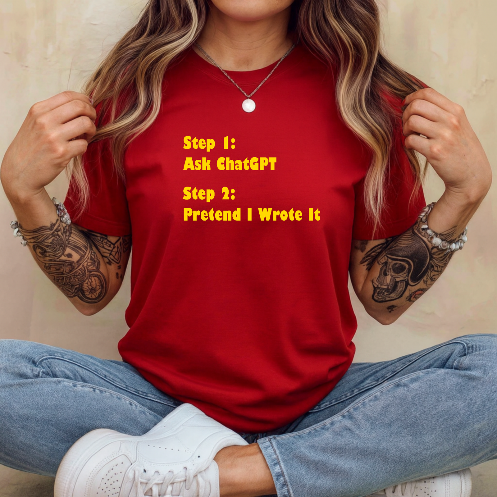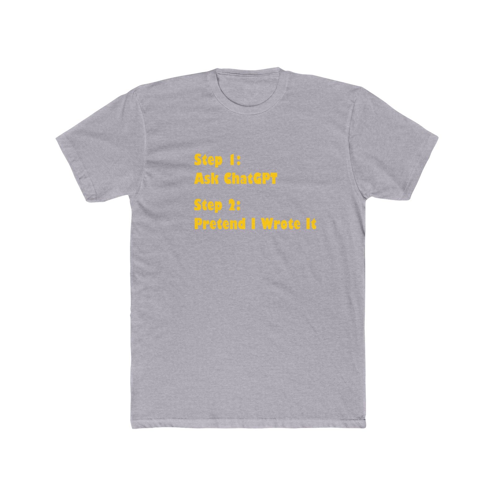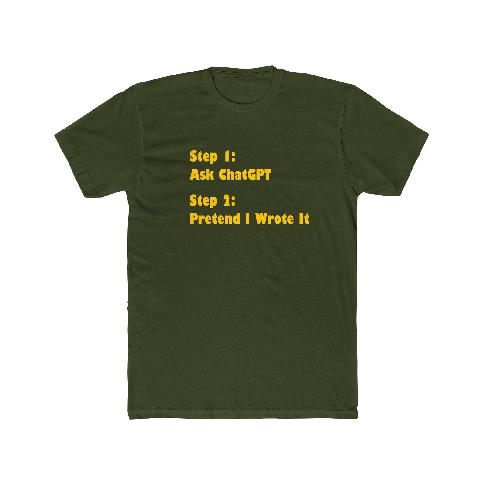 The design presents a sarcastic two-step guide to content creation: “Step 1: Ask ChatGPT” followed by “Step 2: Pretend I Wrote It”. This design is a perfect “insider joke” for students, copywriters, software developers, and tech-savvy professionals.