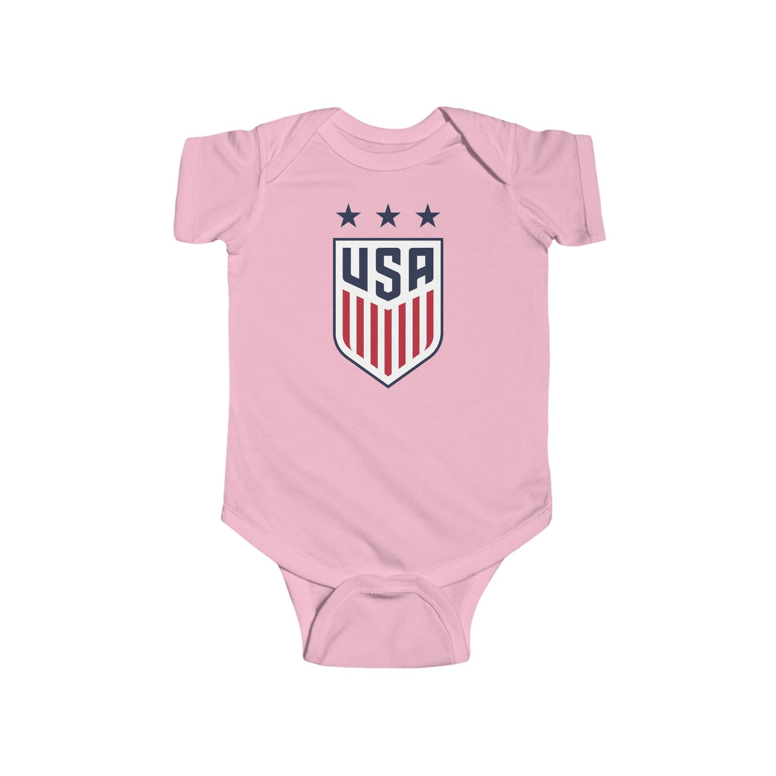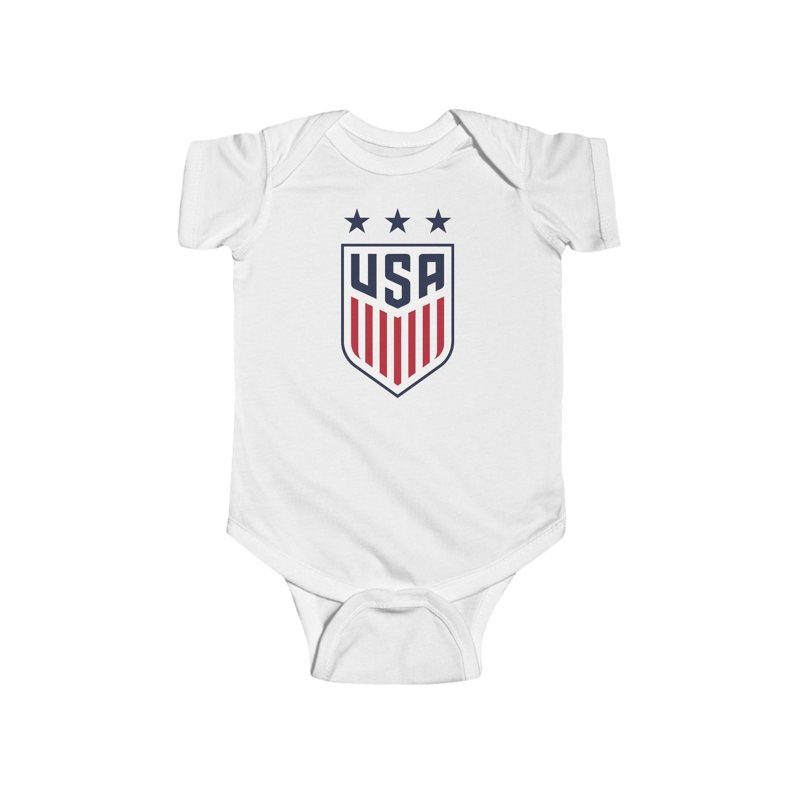 USA soccer baby bodysuit, United States football onesie, patriotic infant shield shirt, stars and stripes baby romper, US national team baby gift, soccer fan newborn clothes, red white and blue onesie, athletic baby shower gift, white cotton soccer bodysuit, USA pride infant wear