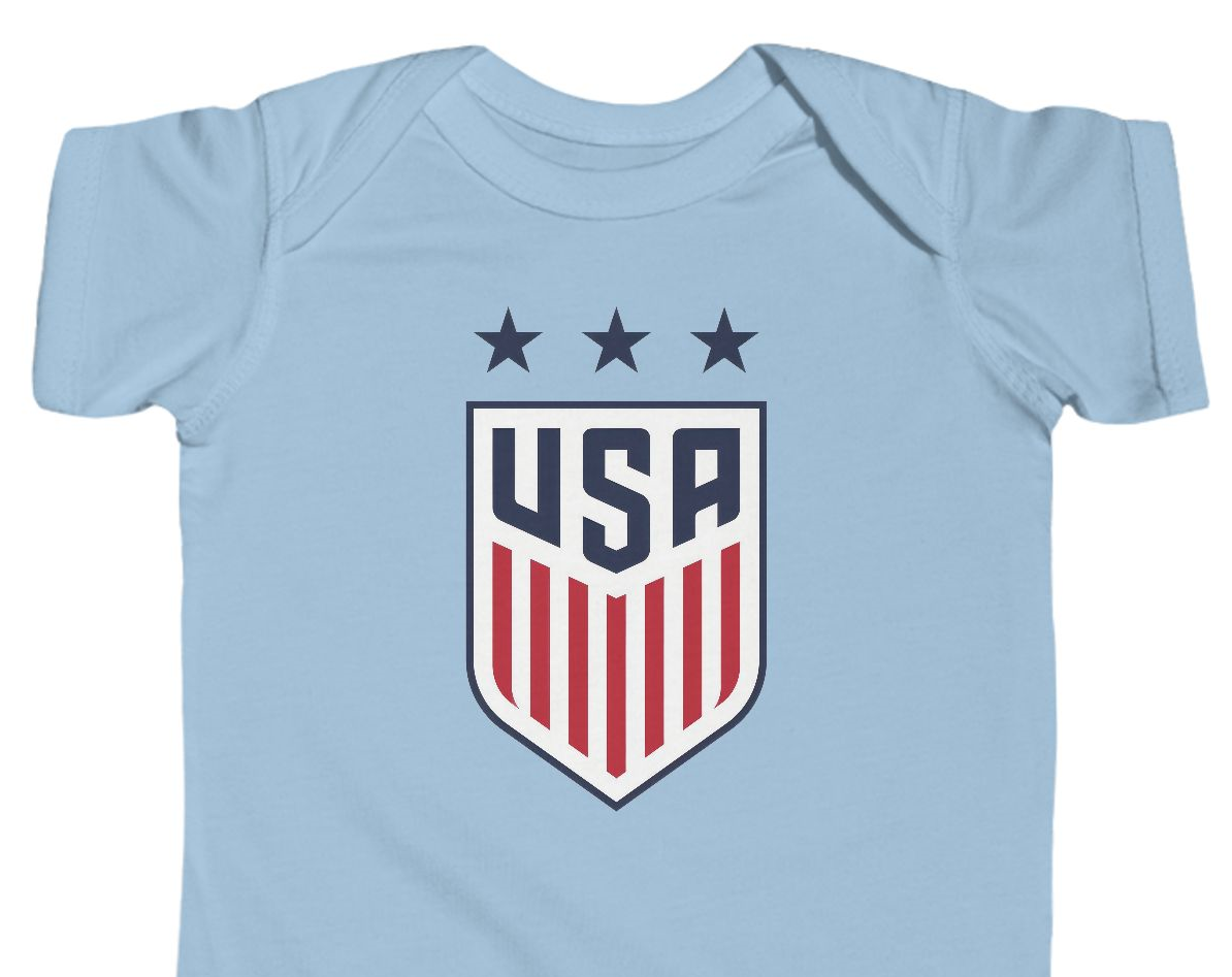 United States National Team Baby Onesie – Red White and Blue Soccer Shield – Soft Cotton White Newborn Bodysuit Baby Shower Gift