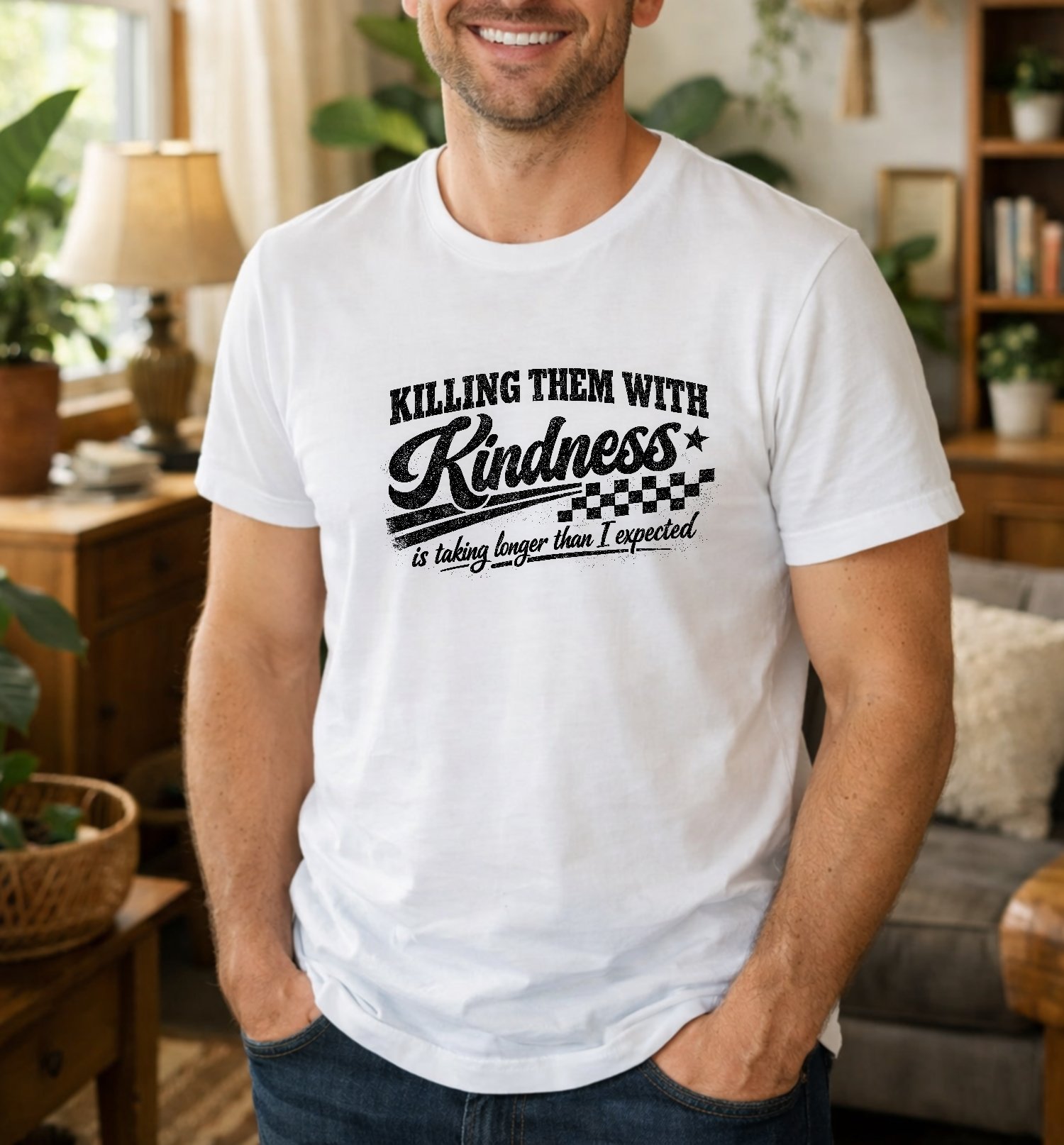 Sarcastic Quote Shirt, Killing Them With Kindness, Funny Graphic Tee, Vintage Aesthetic Shirt, Retro Typography Tee, Sassy Women’s Shirt, Relatable Humor Tee, Distressed Graphic T-shirt, Checkerboard Aesthetic, 90s Style Quote Shirt, Introvert Humor Gift, Petty Quote Apparel, Sarcastic Office Shirt, Trendy Pinterest Aesthetic.
