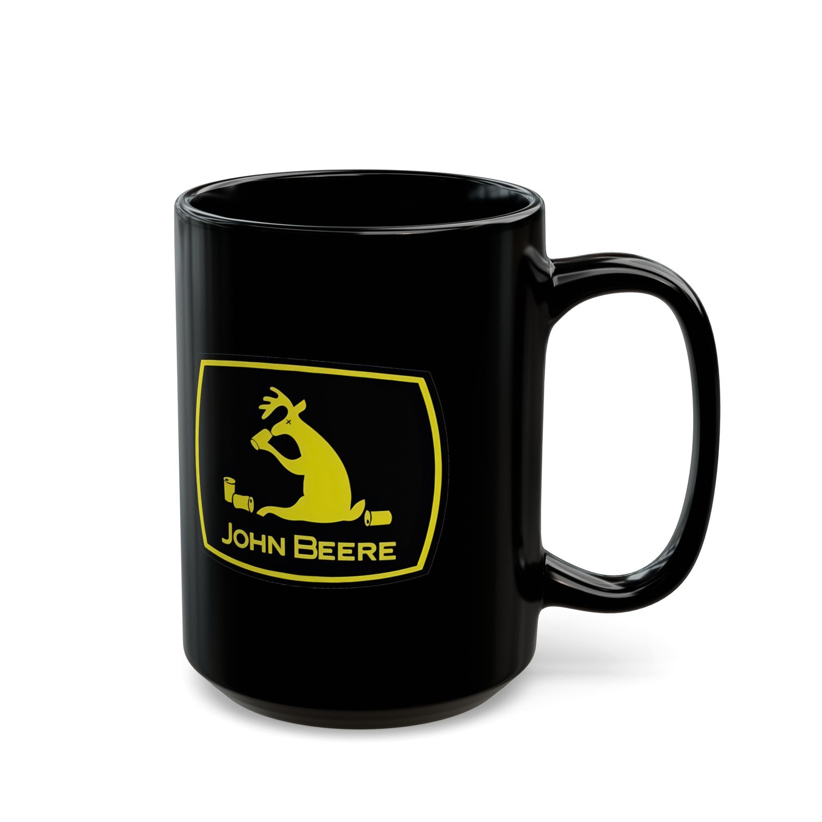 John Beere mug, funny parody coffee cup, hunting humor gift, farmer joke mug, beer drinking deer, witty black ceramic mug, unique gift for him, agricultural parody, humorous kitchenware.