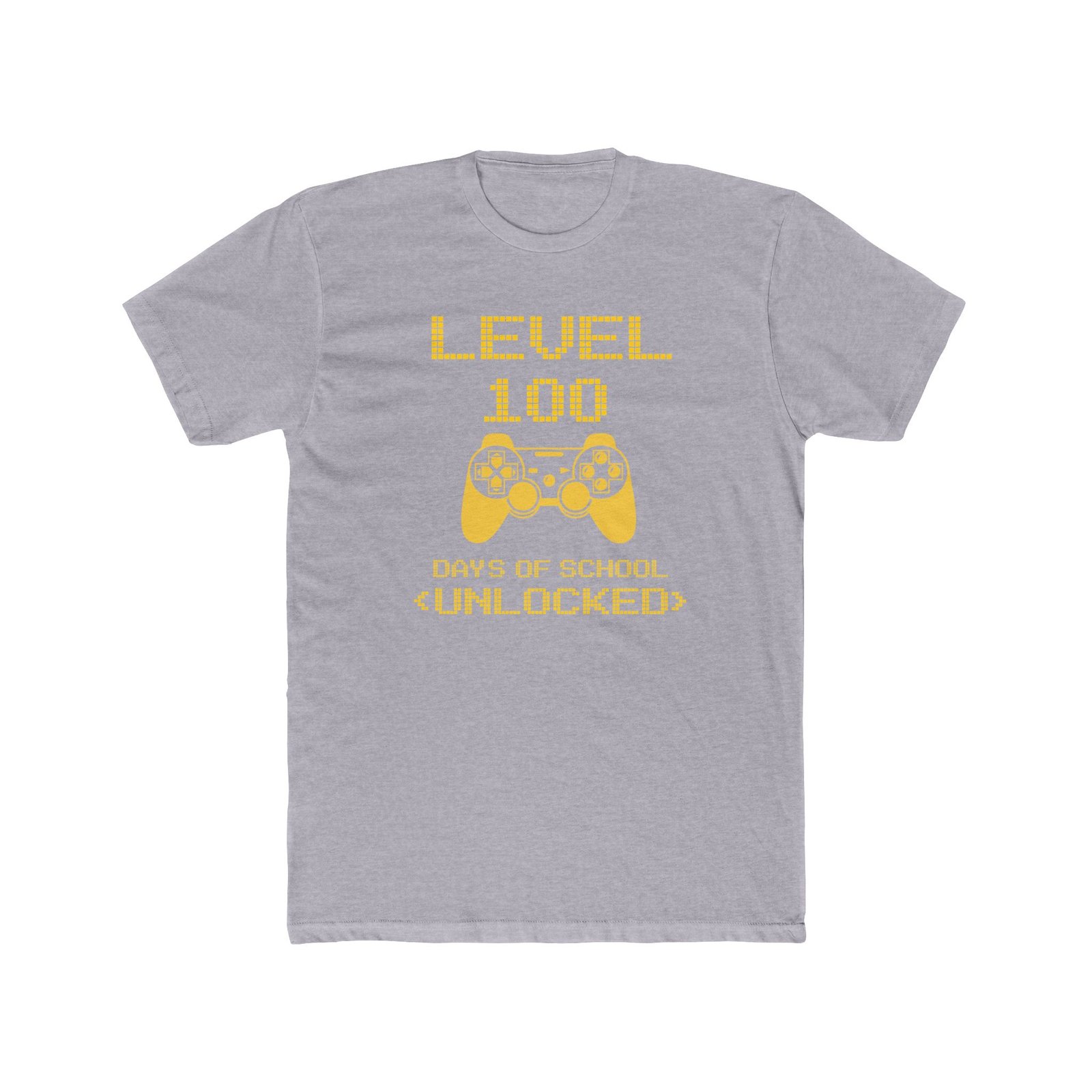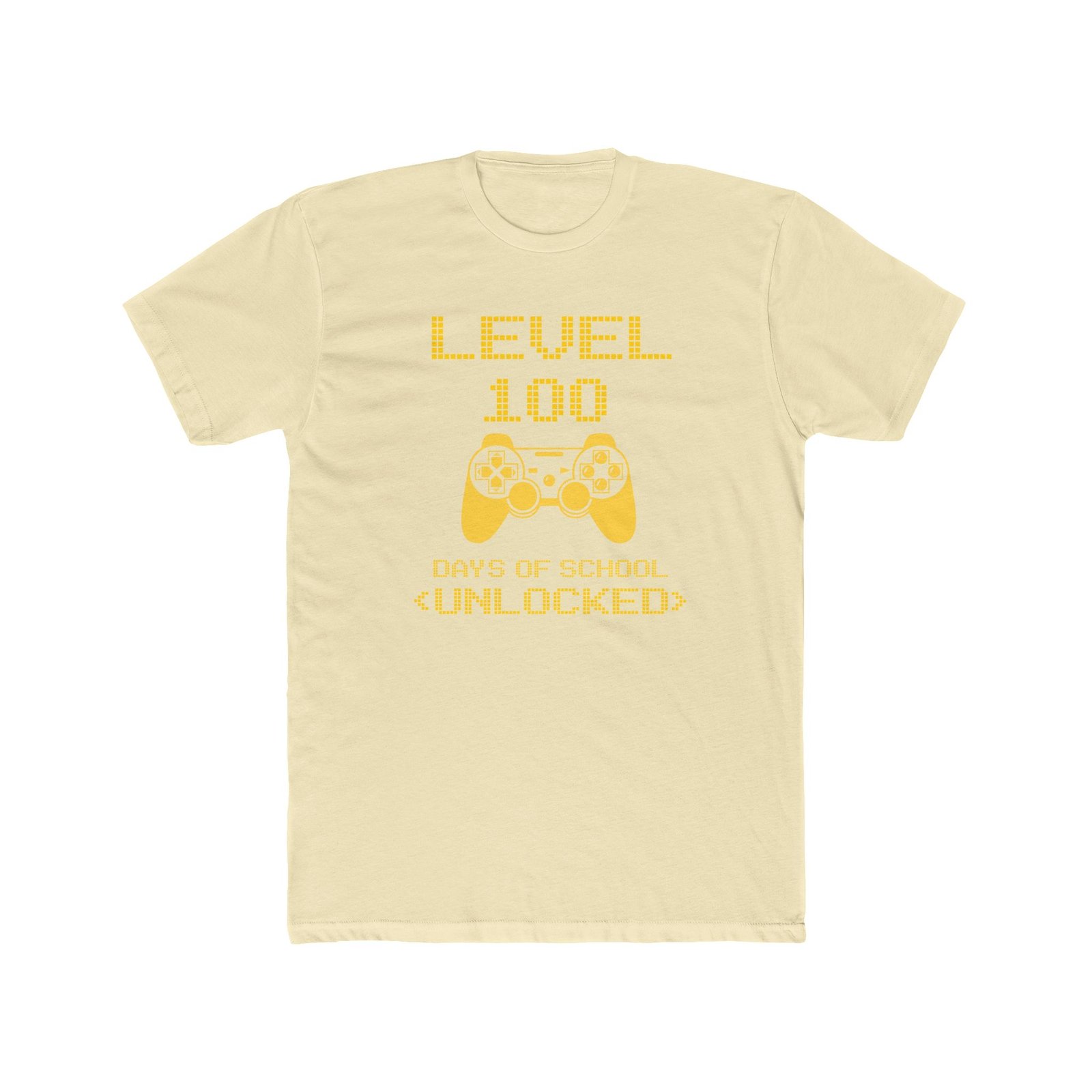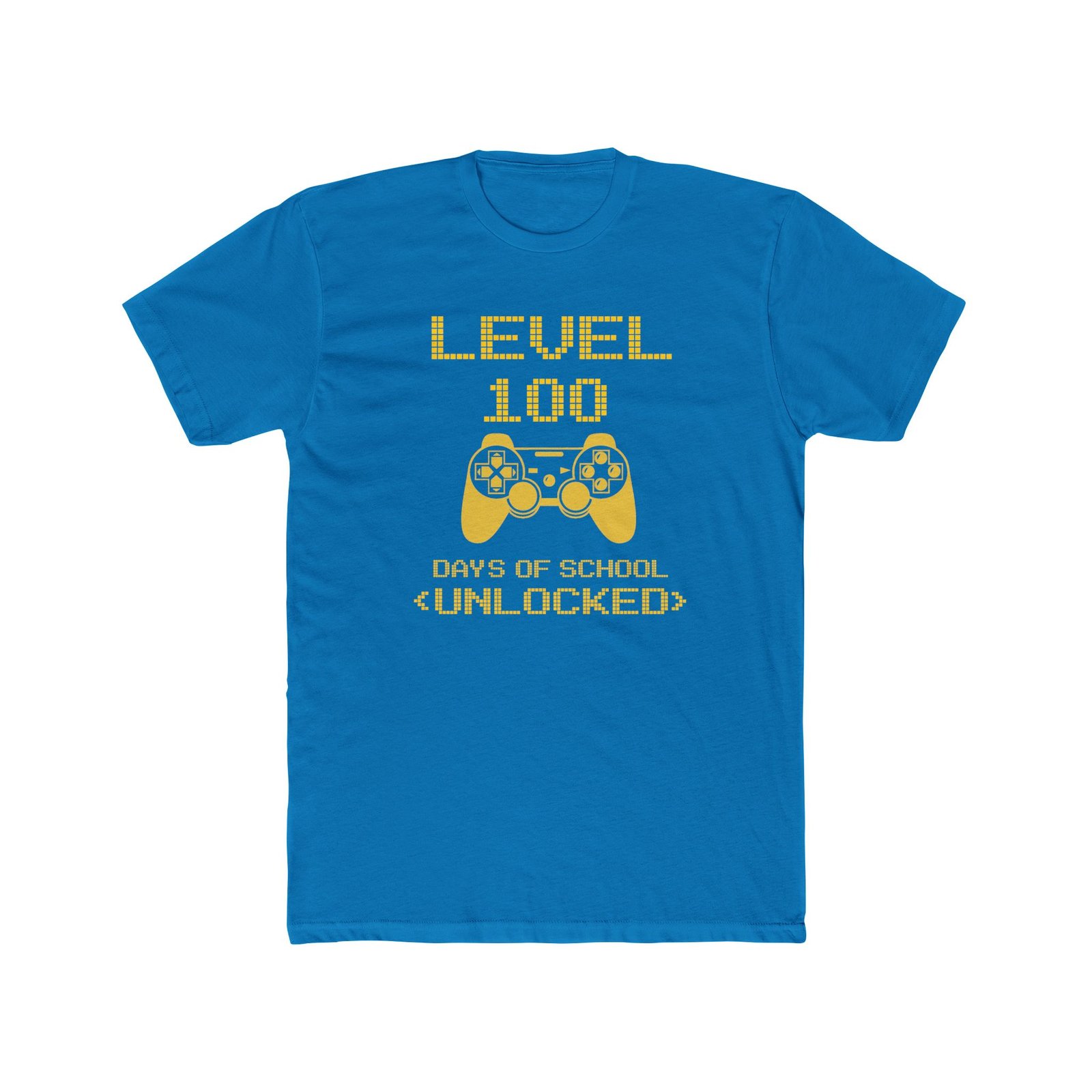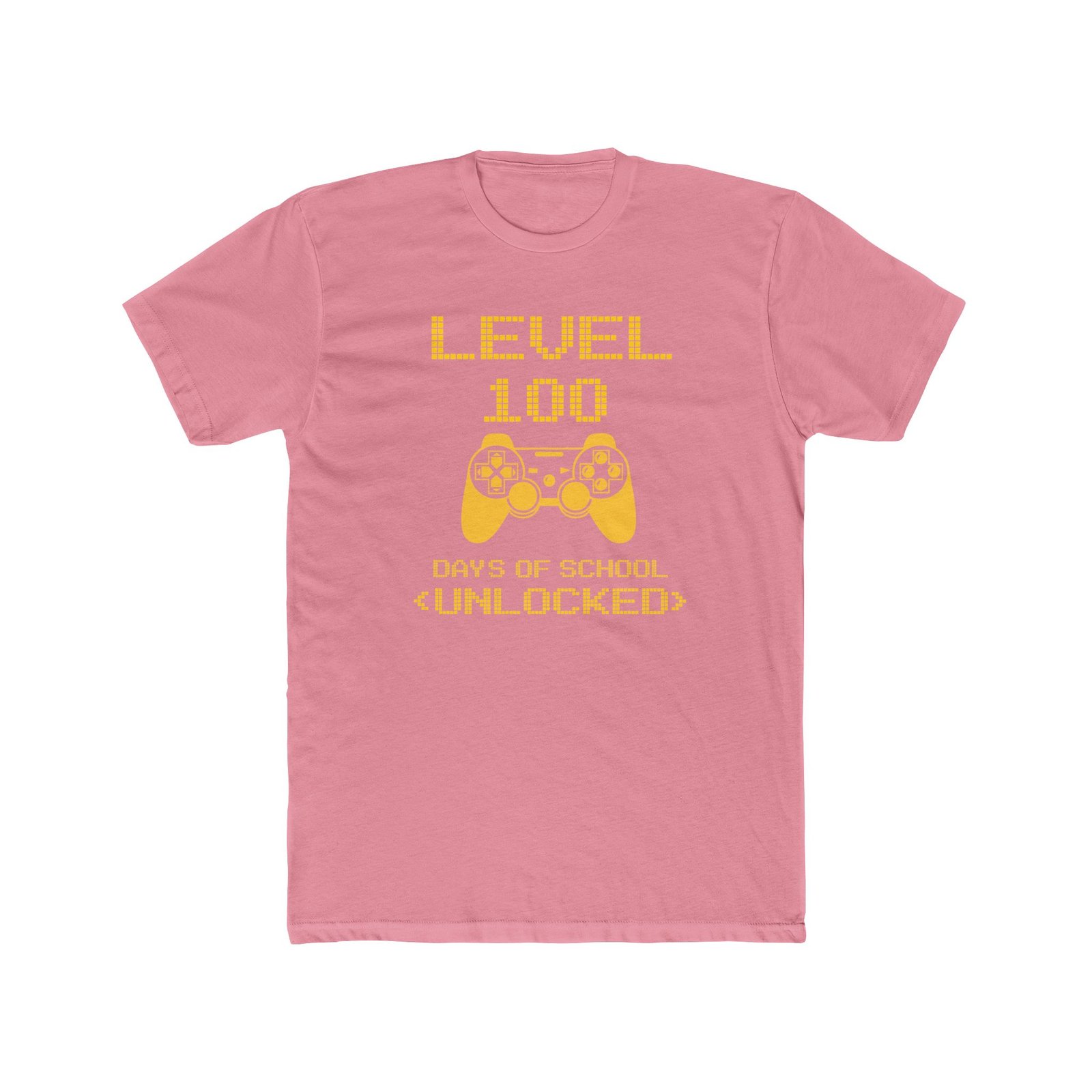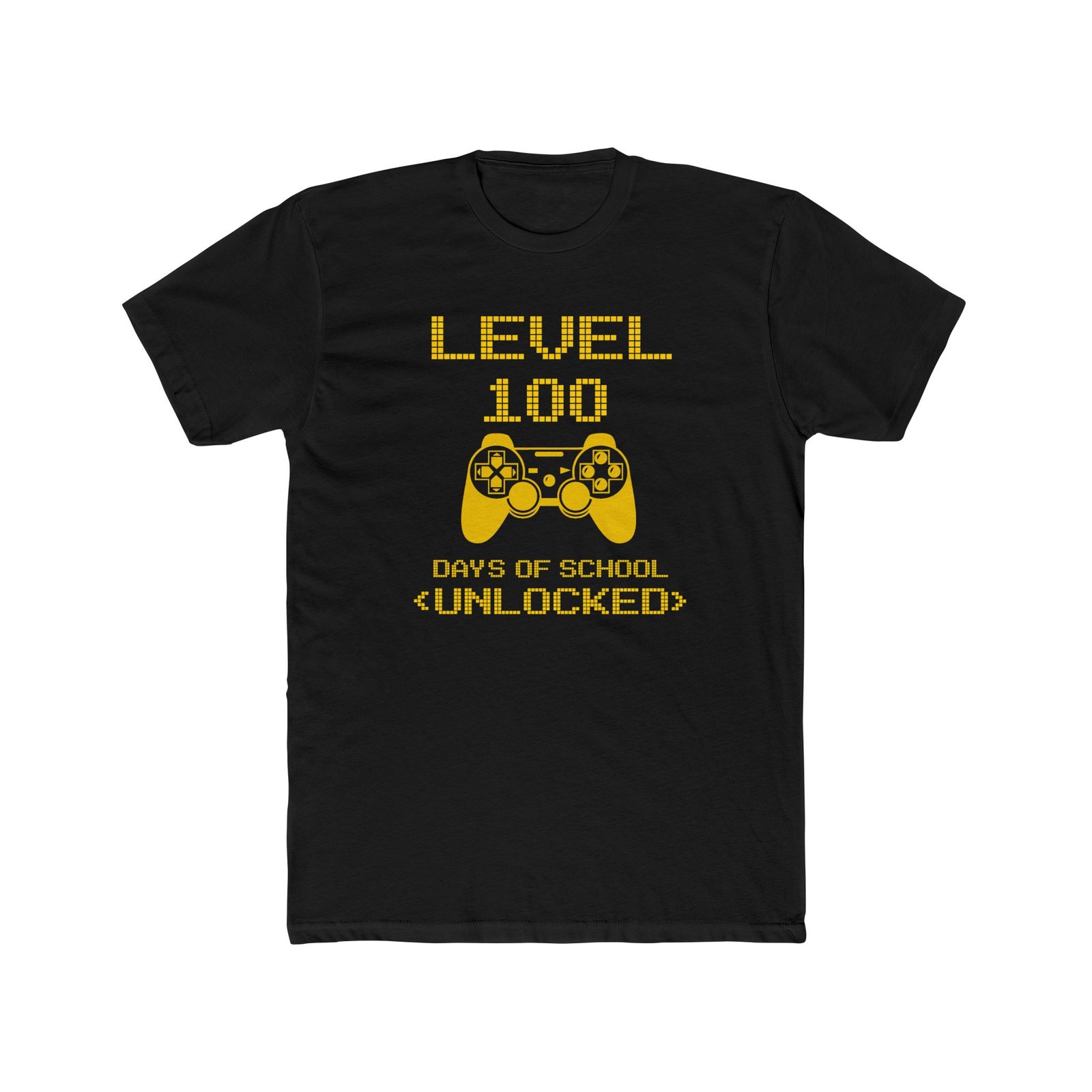Celebrate a major academic milestone with this fun and vibrant “Level 100 Days of School Unlocked” t-shirt. The design features eye-catching yellow pixelated typography and a classic video game controller icon, perfect for students who love gaming. Printed on a high-quality black unisex t-shirt, this bold graphic is a standout choice for 100th day of school parties, classroom events, or as a fun gift for a dedicated student.