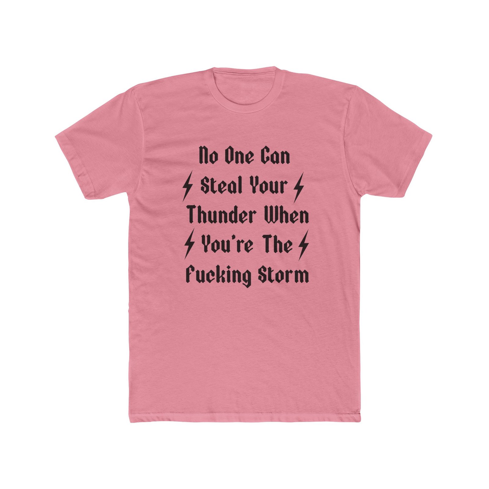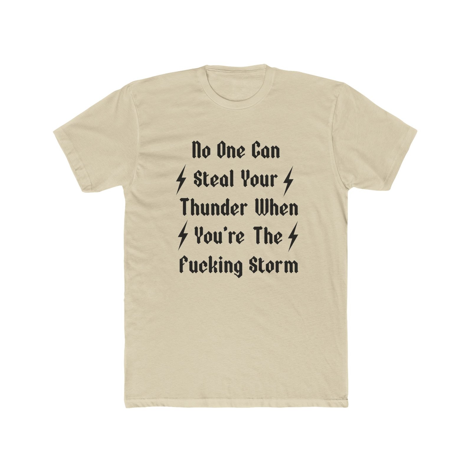 Empower your daily wardrobe with this bold, motivational statement piece. The design features the powerful quote “No One Can Steal Your Thunder When You’re The Fucking Storm” rendered in a striking black gothic-style typeface. This crisp graphic is perfect for those who want to project strength, confidence, and a bit of attitude.