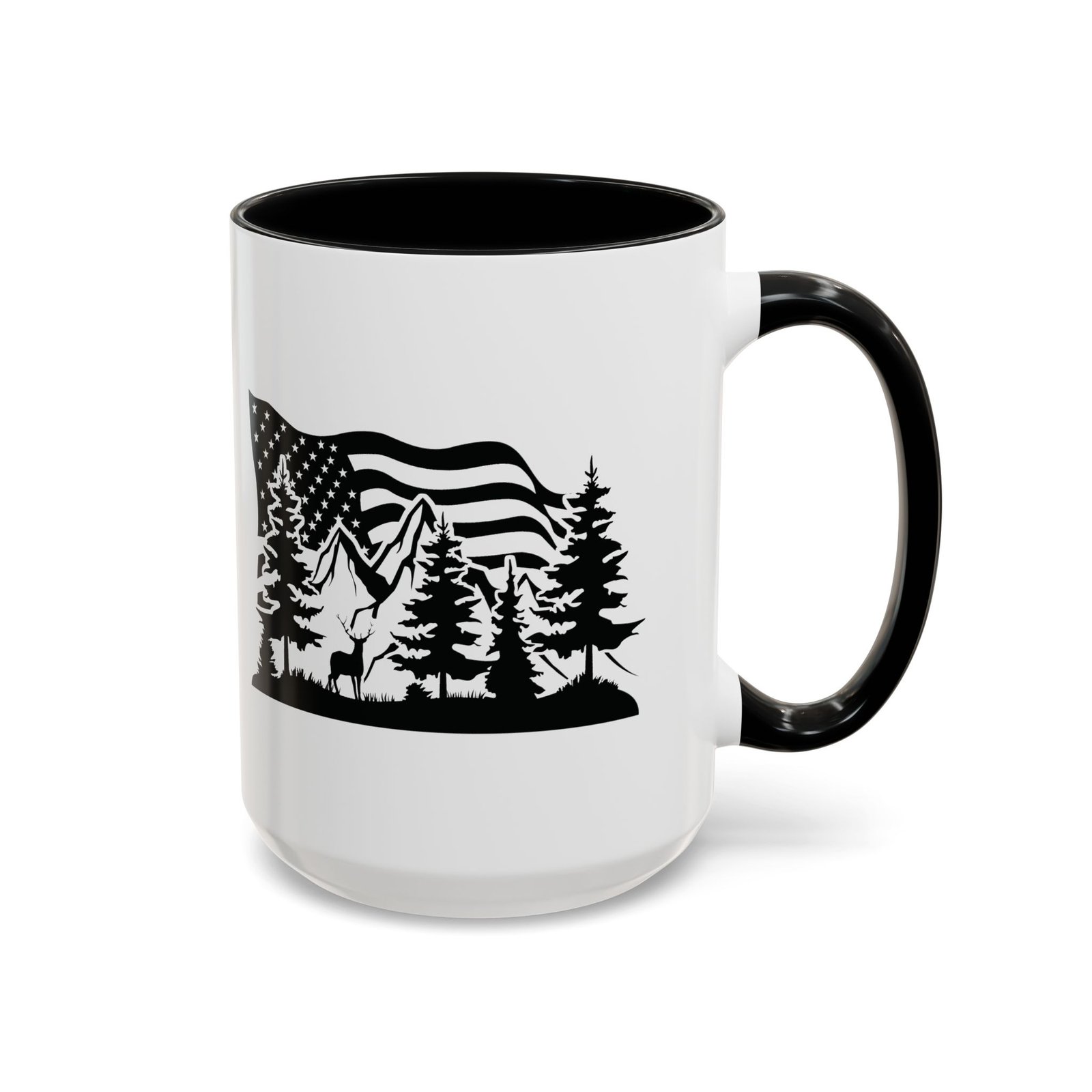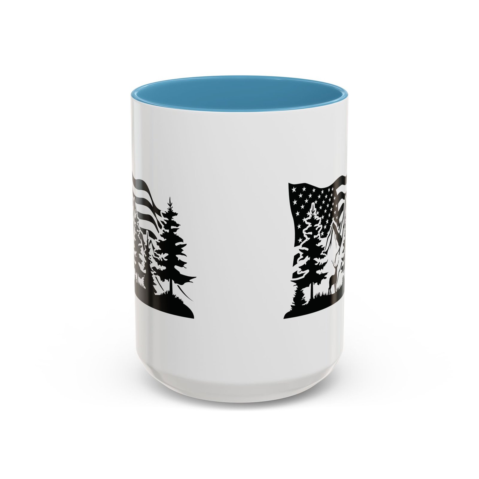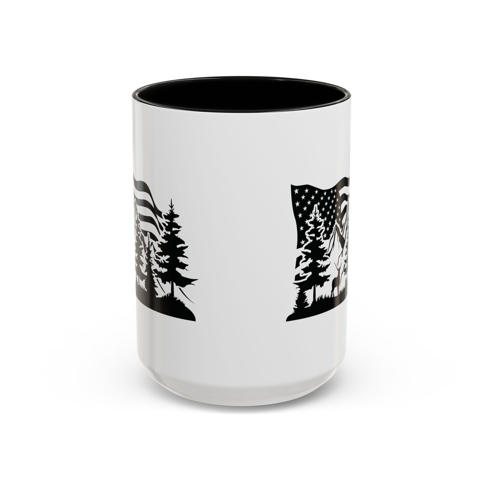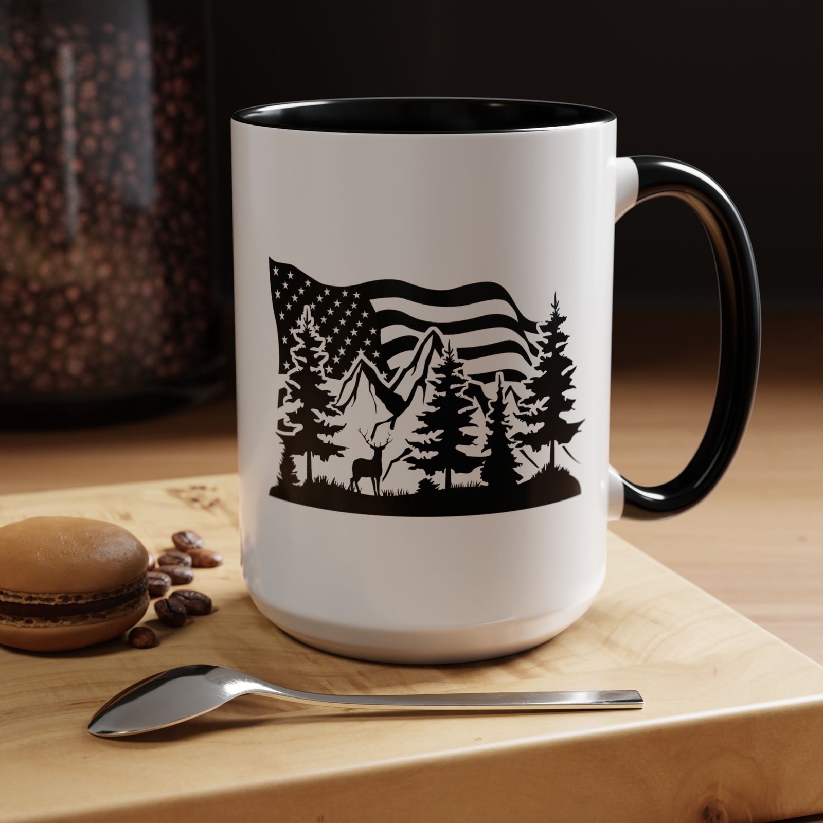 Patriotic Mountain Forest Coffee Mug – American Flag & Wilderness Graphic Coffee Mug with Premium Quality, Two-Tone Ceramic Cup, Humorous Gift Mug