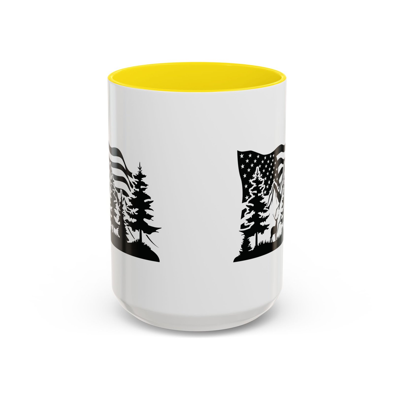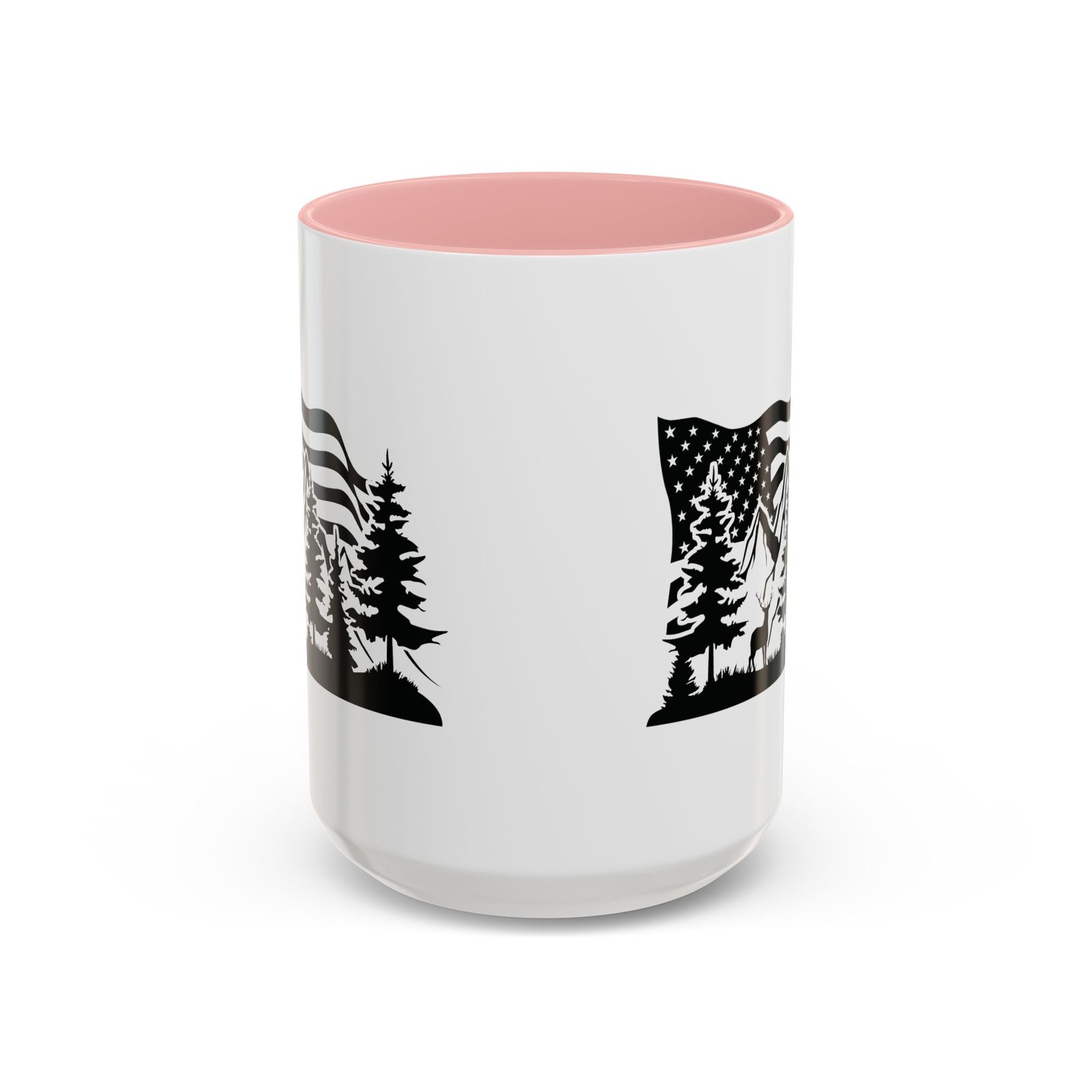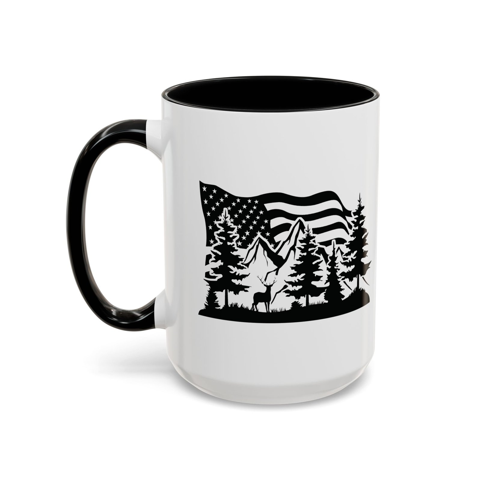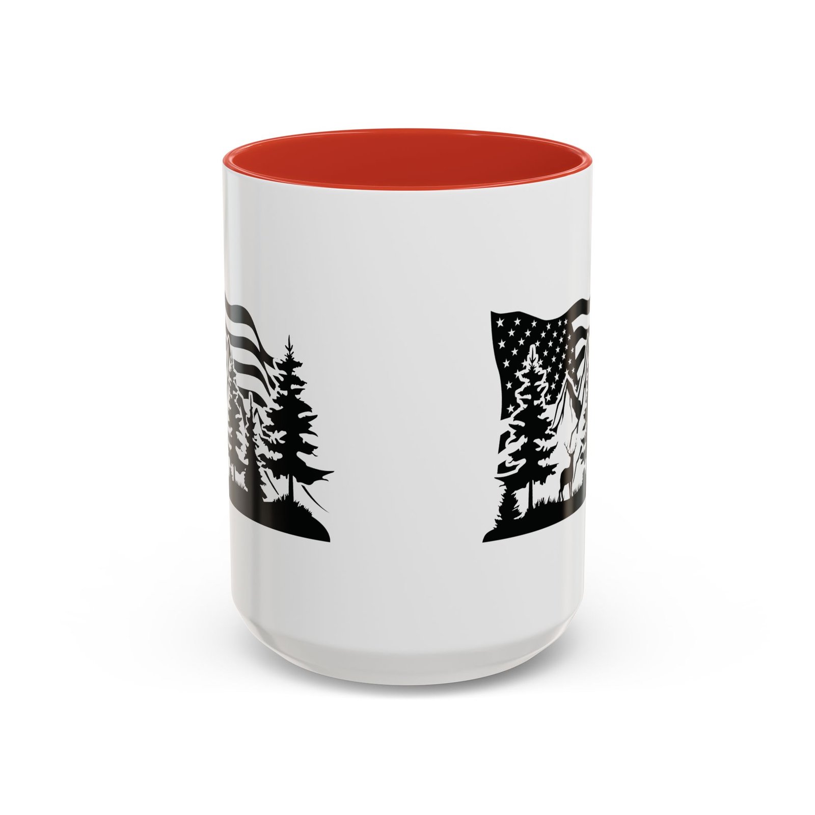 Patriotic Mountain Forest Coffee Mug – American Flag & Wilderness Graphic Coffee Mug with Premium Quality, Two-Tone Ceramic Cup, Humorous Gift Mug