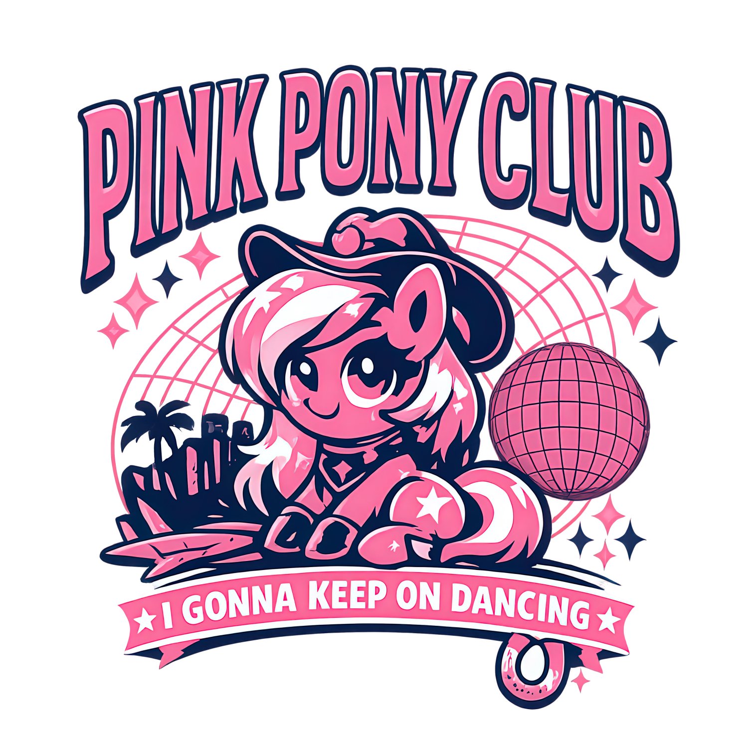 Get ready to dance with this Pink Pony Club digital design! Perfect for pop music fans and lovers of the disco cowgirl aesthetic, this graphic features a cute pony in a cowboy hat, a disco ball, and tropical vibes. Whether you’re making concert outfits or trendy stickers, this high-quality file is ready for your next DIY project.