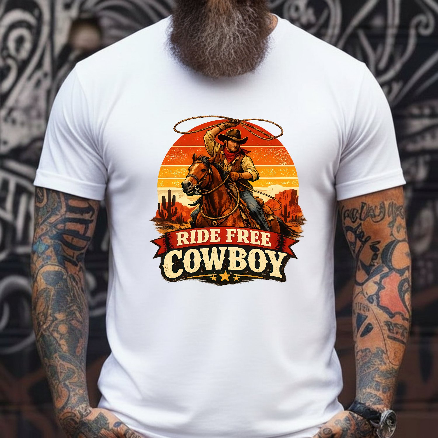 Ride Free Cowboy Shirt, Vintage Western Graphic Tee, Retro Sunset Cowboy, Desert Rodeo Apparel, Country Life T-shirt, Lassoing Horse Rider, Southwestern Aesthetic, Gift for Cowboy, Rustic Western Wear, Distressed Retro Tee, American Frontier Shirt, Equestrian Graphic Top, Wild West Fashion, Men’s Western Shirt, Unisex Country Tee