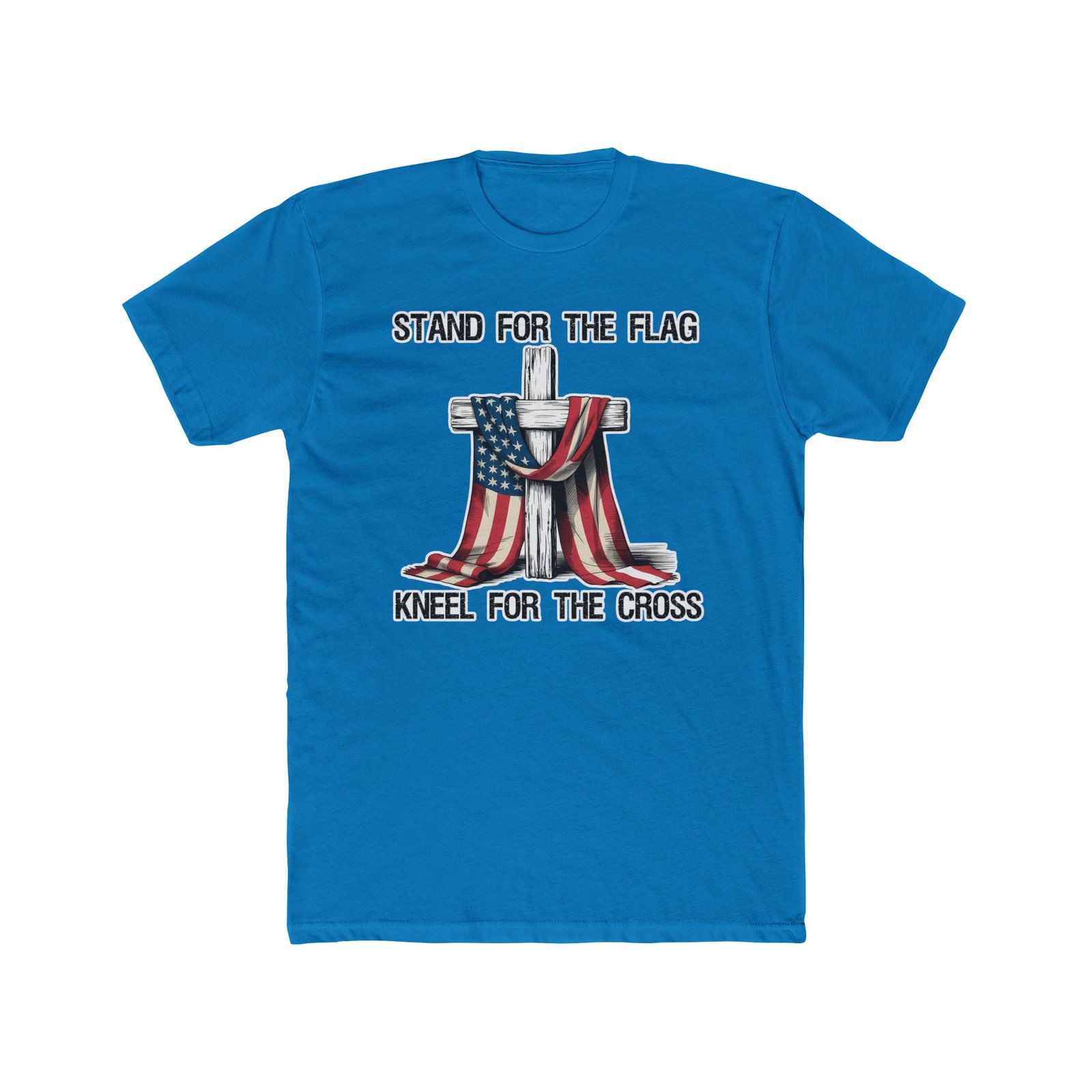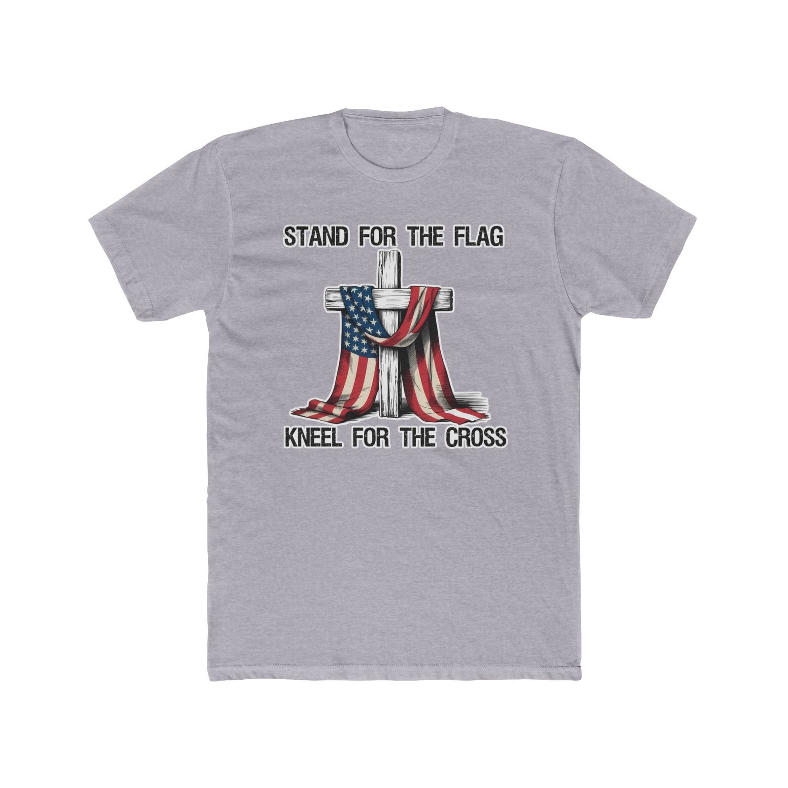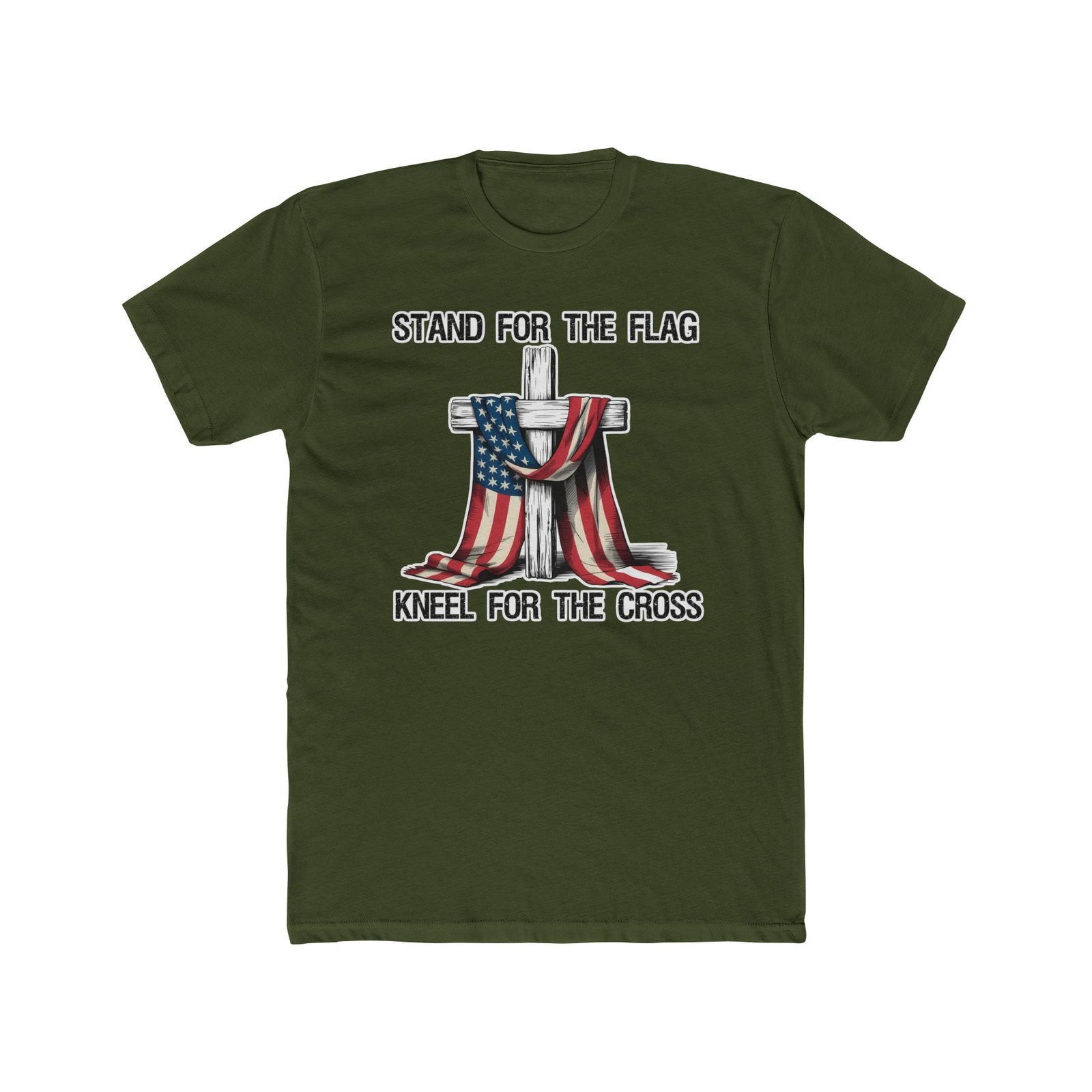 “Stand for the Flag, Kneel for the Cross” Patriotic T-Shirt – American Flag & Wooden Cross Graphic – Faith-Based Tee – Unisex Tee Shirt Premium Fitted 100% Cotton Tee