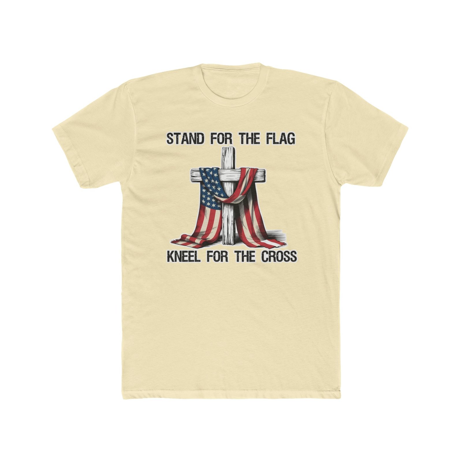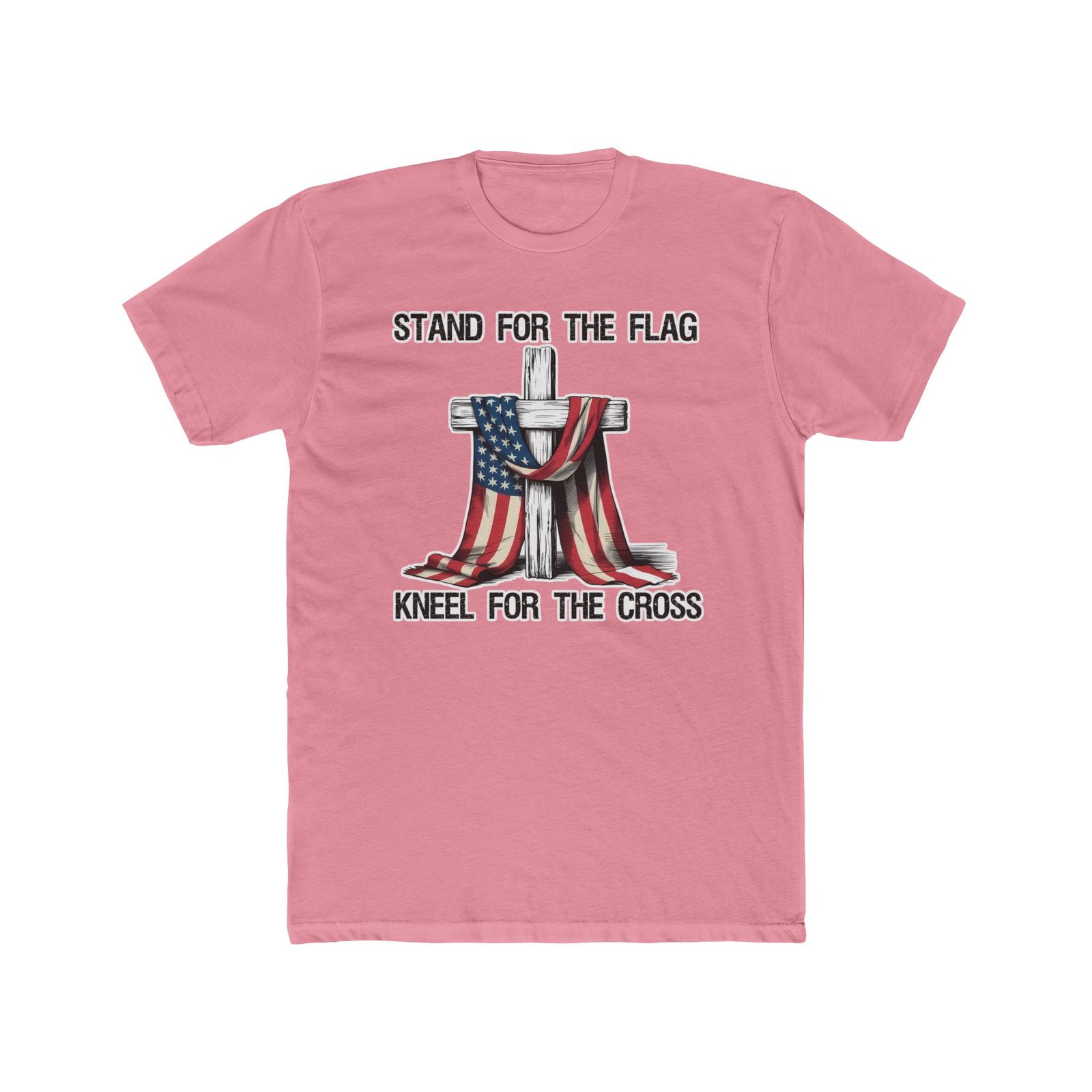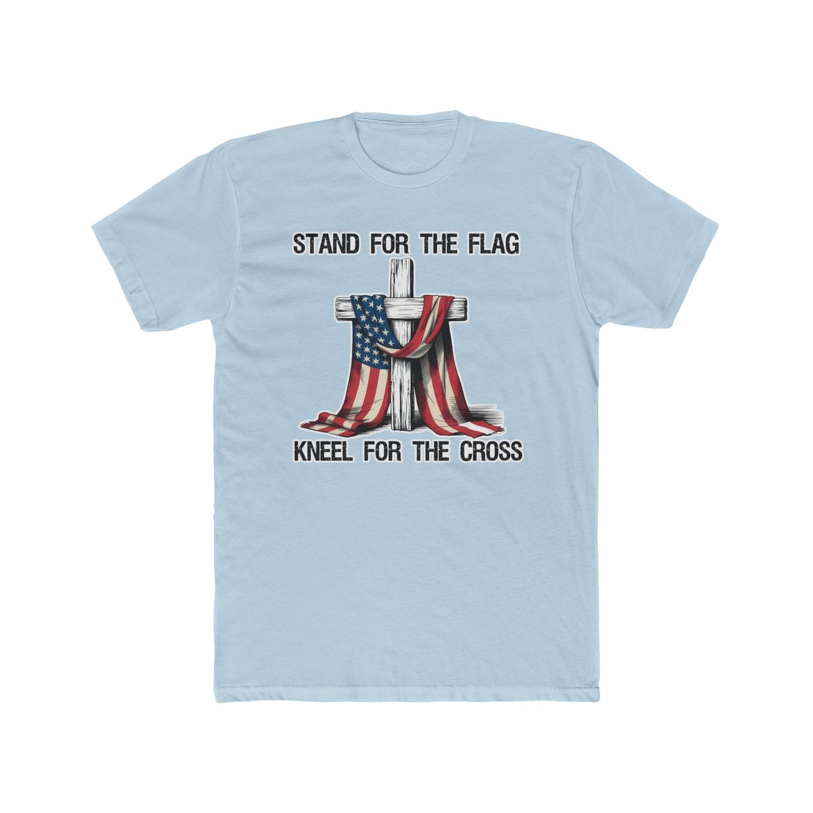 “Stand for the Flag, Kneel for the Cross” Patriotic T-Shirt – American Flag & Wooden Cross Graphic – Faith-Based Tee – Unisex Tee Shirt Premium Fitted 100% Cotton Tee