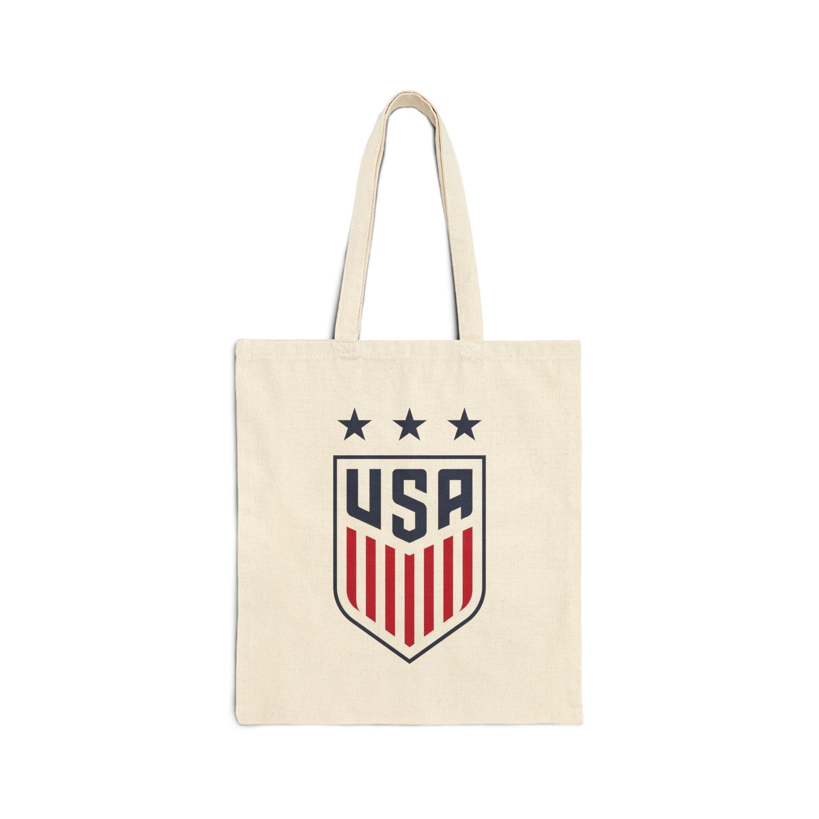 USA soccer tote bag, US national team fan bag, patriotic shield canvas tote, red white and blue shopping bag, soccer fan gift, stars and stripes carryall, natural cotton heritage bag, athletic pride tote, USA match day gear, durable patriotic market bag.