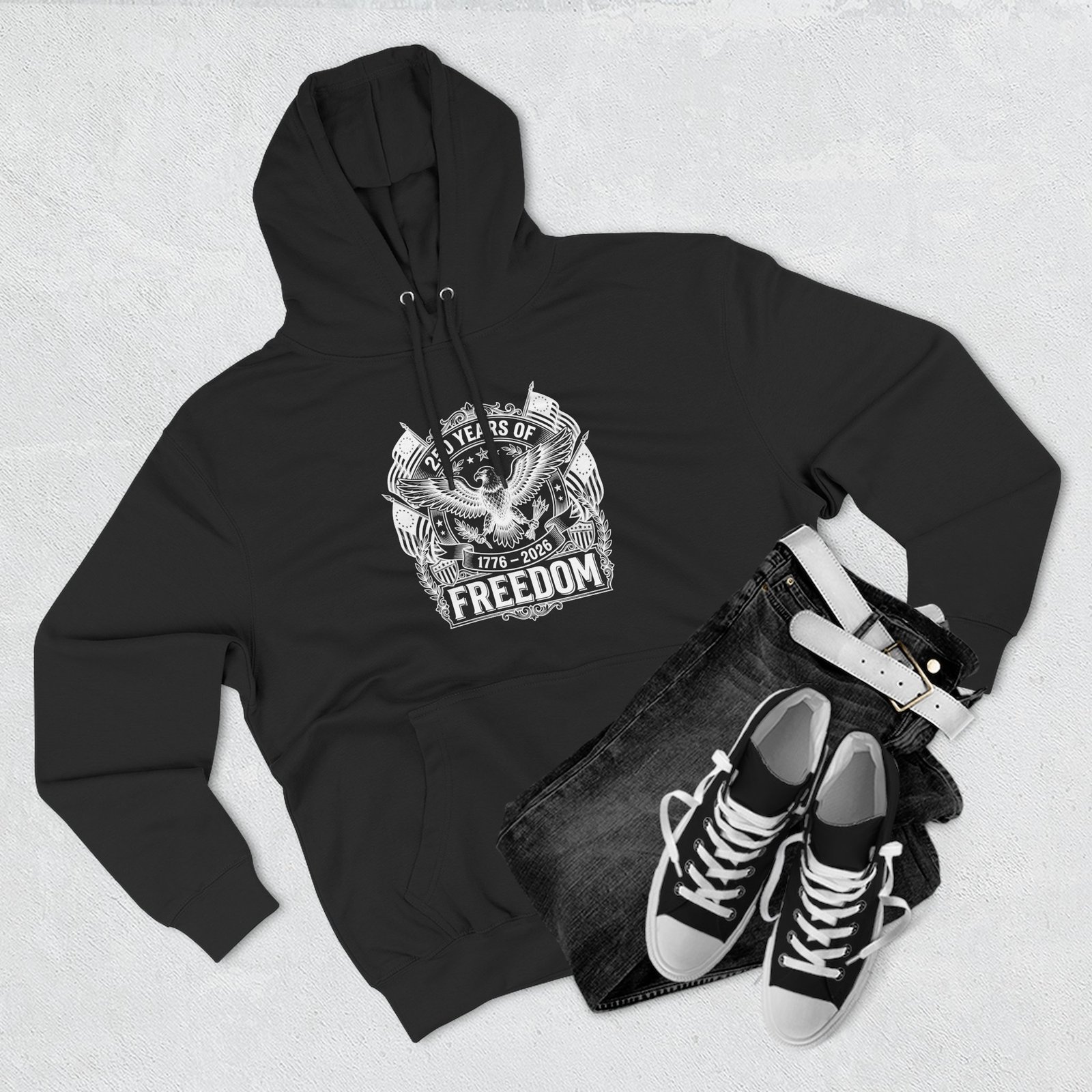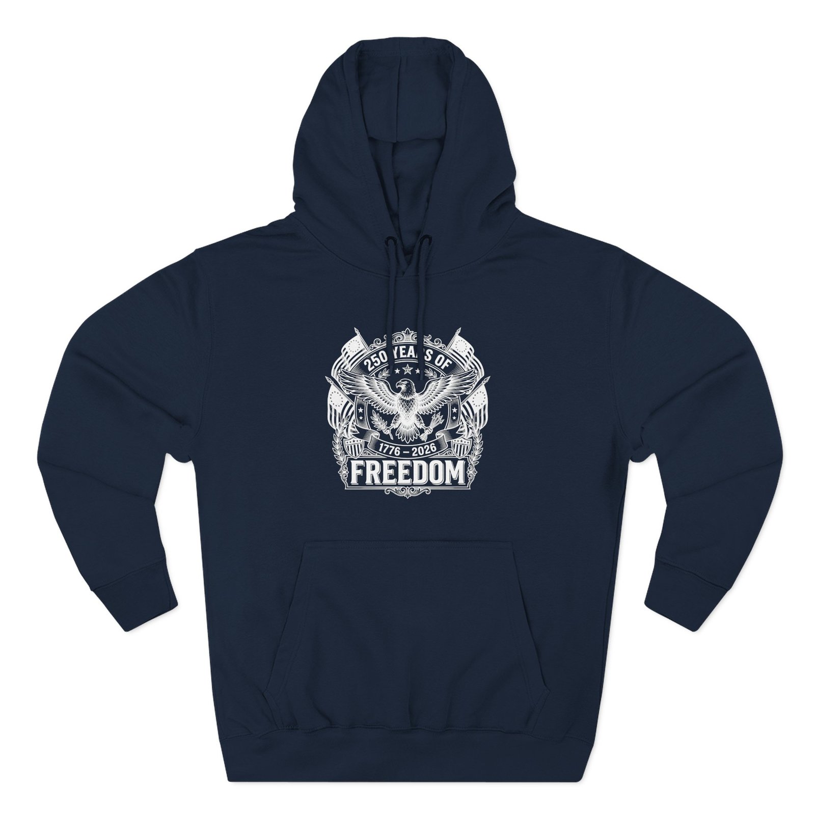Celebrate the American milestone with this “250 Years of Freedom” commemorative design featuring a detailed bald eagle crest, flags, and the historic 1776–2026 dates, available on a crisp white t-shirt, a bold red hoodie, and a classic black hoodie.