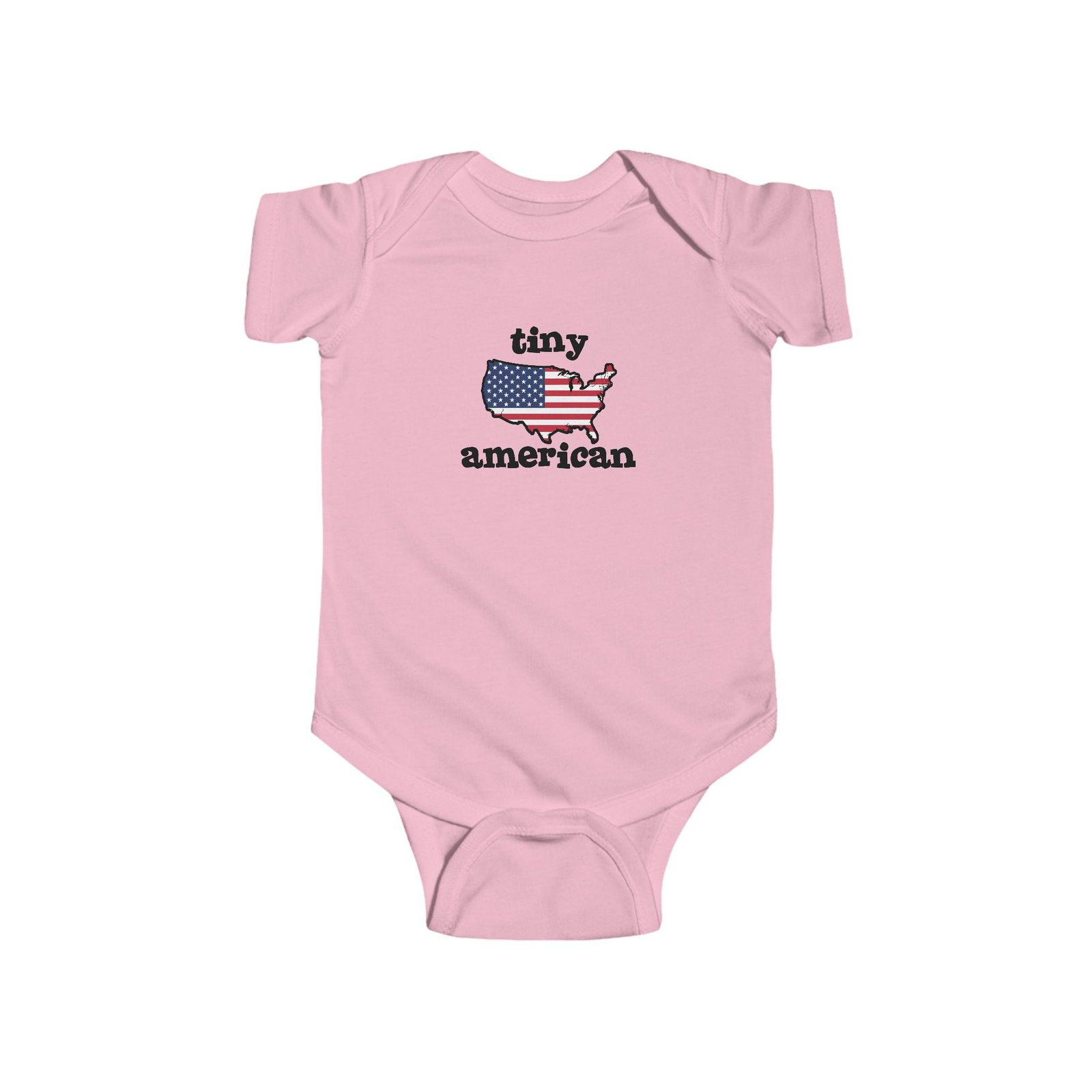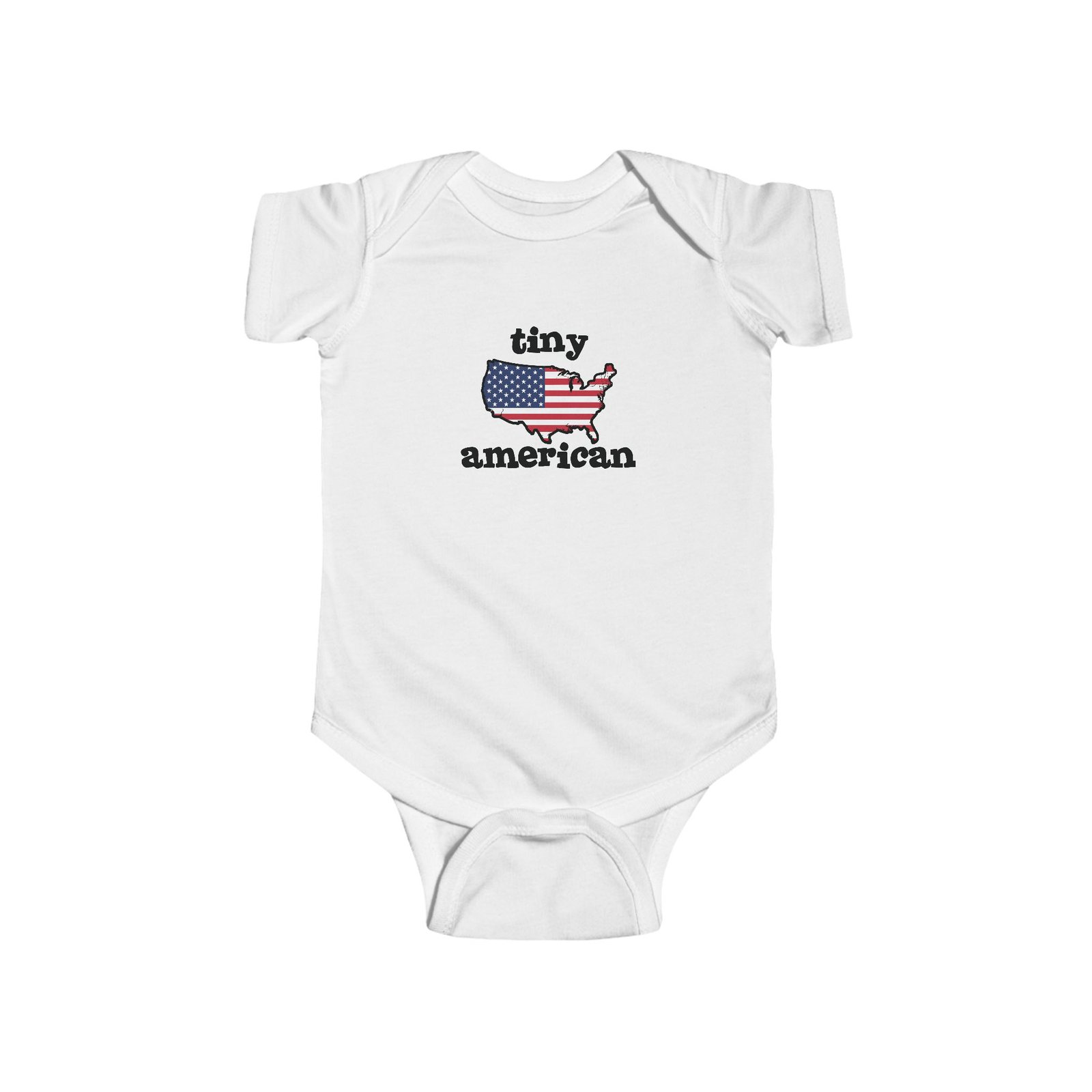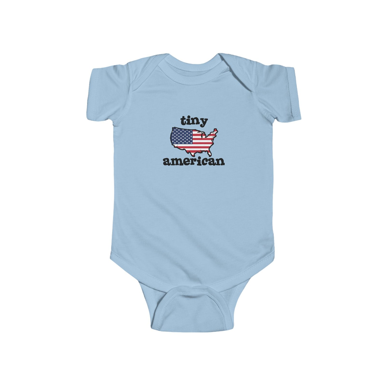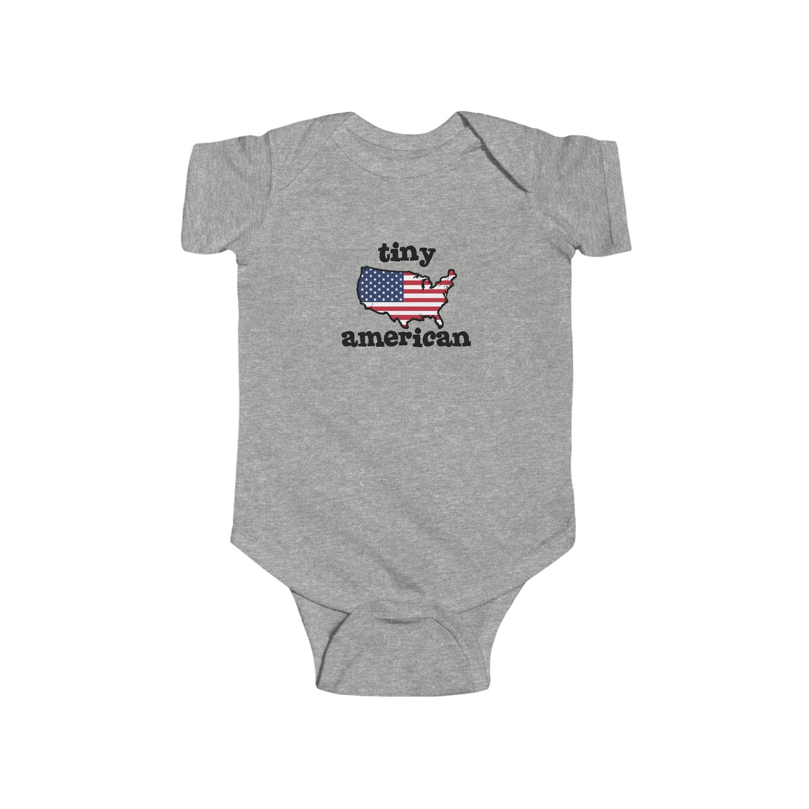 USA Flag Map Baby Onesie “Tiny American” Patriotic Quote Soft Cotton Newborn Bodysuit Soft Heather Gender Neutral Premium