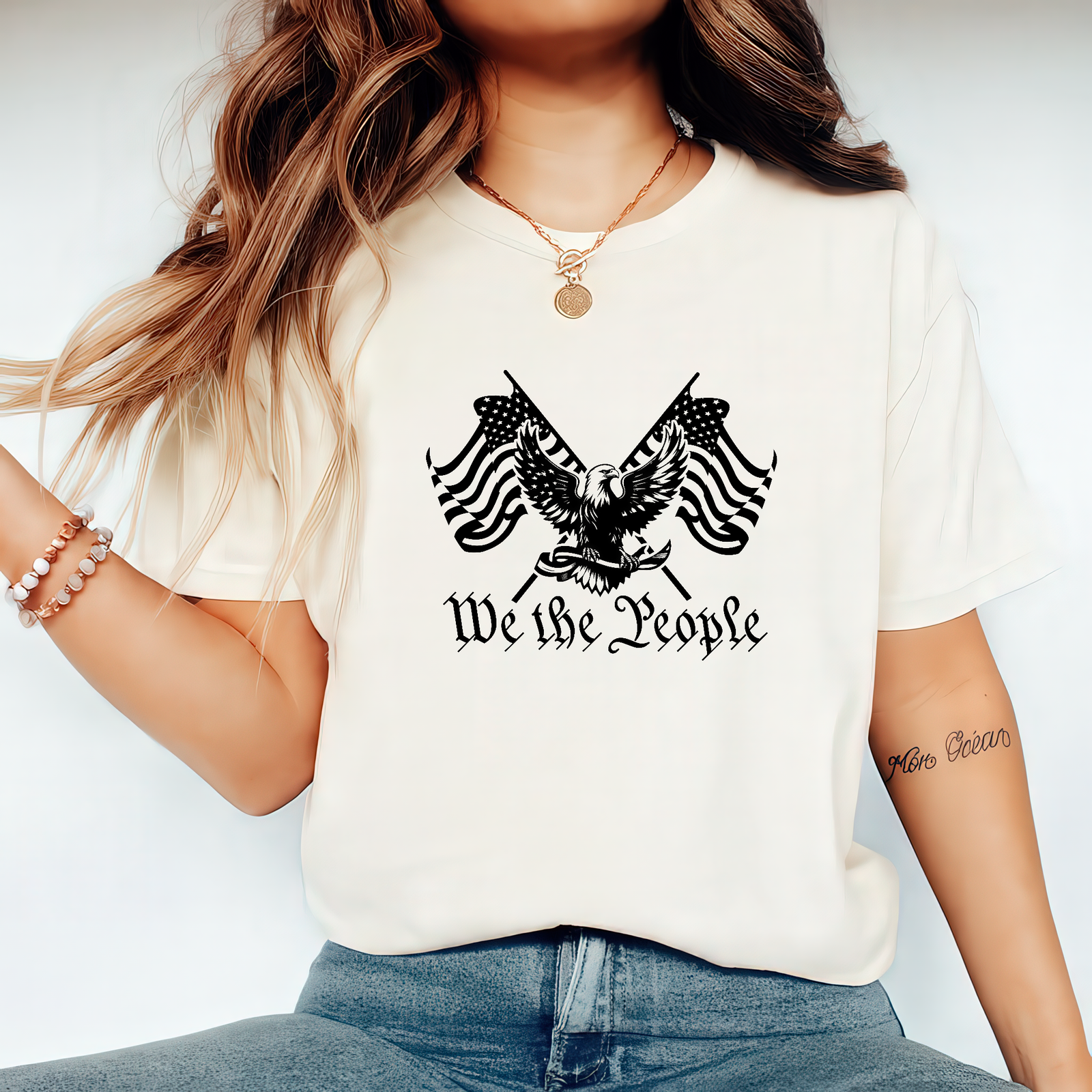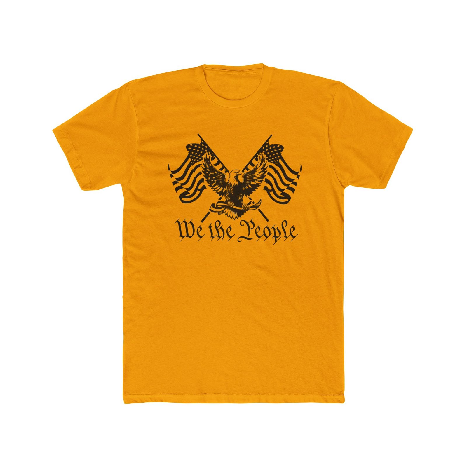A lightweight cotton crew tee that wears like a quiet declaration. The front features a stylized eagle flanked by waving American flags and the phrase “We the People” in an aged script — a vintage-inspired graphic that reads like a page from an old pamphlet.