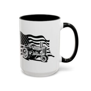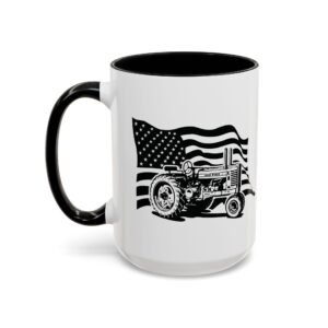 Patriotic American Flag John Deere Tractor Coffee Mug – 15oz Ceramic Farm Life Cup with Black Handle – Vintage Farmer Gift